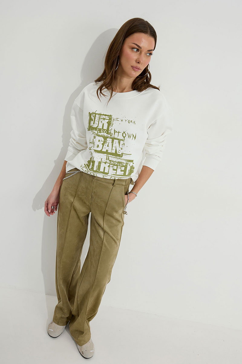 Брюки прямого силуэта из трикотажного полотна “замша”. По верху притачной пояс с застежкой на петлю и пуговицу и шлевками для ремня. На передних половинках обработаны карманы, канты и застежка молния в среднем шве, на задних – вытачки. По поясу задних половинок брюк эластичная тесьма (резинка). Обращаем ваше внимание, что фурнитура может отличаться от фото. Декоративный элемент - цепочка в комплектацию не входит.