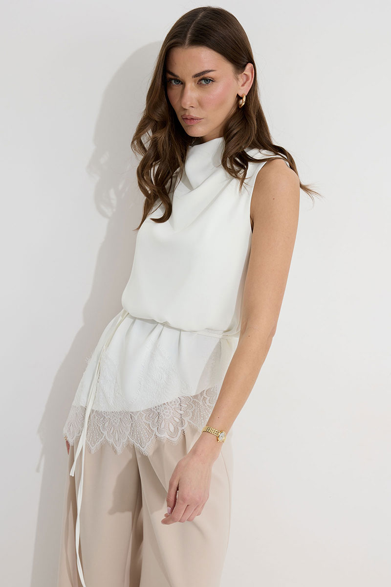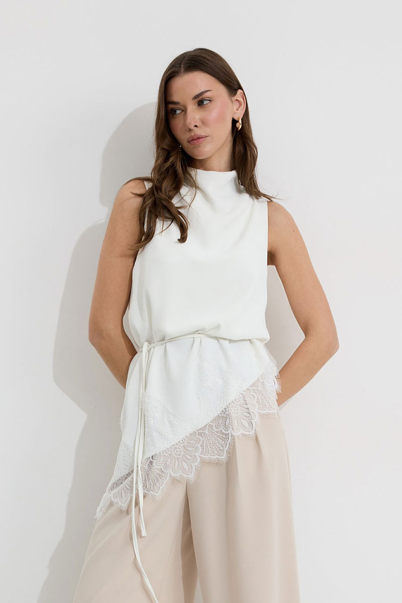 Ассиметричная блузка полуприлегающего силуэта из струящейся ткани. Горловина цельнокроеная. По низу декоративная тесьма( кружево). По низу в боковом шве разрез. Пояс-шнурок из основной ткани идет в комплект.