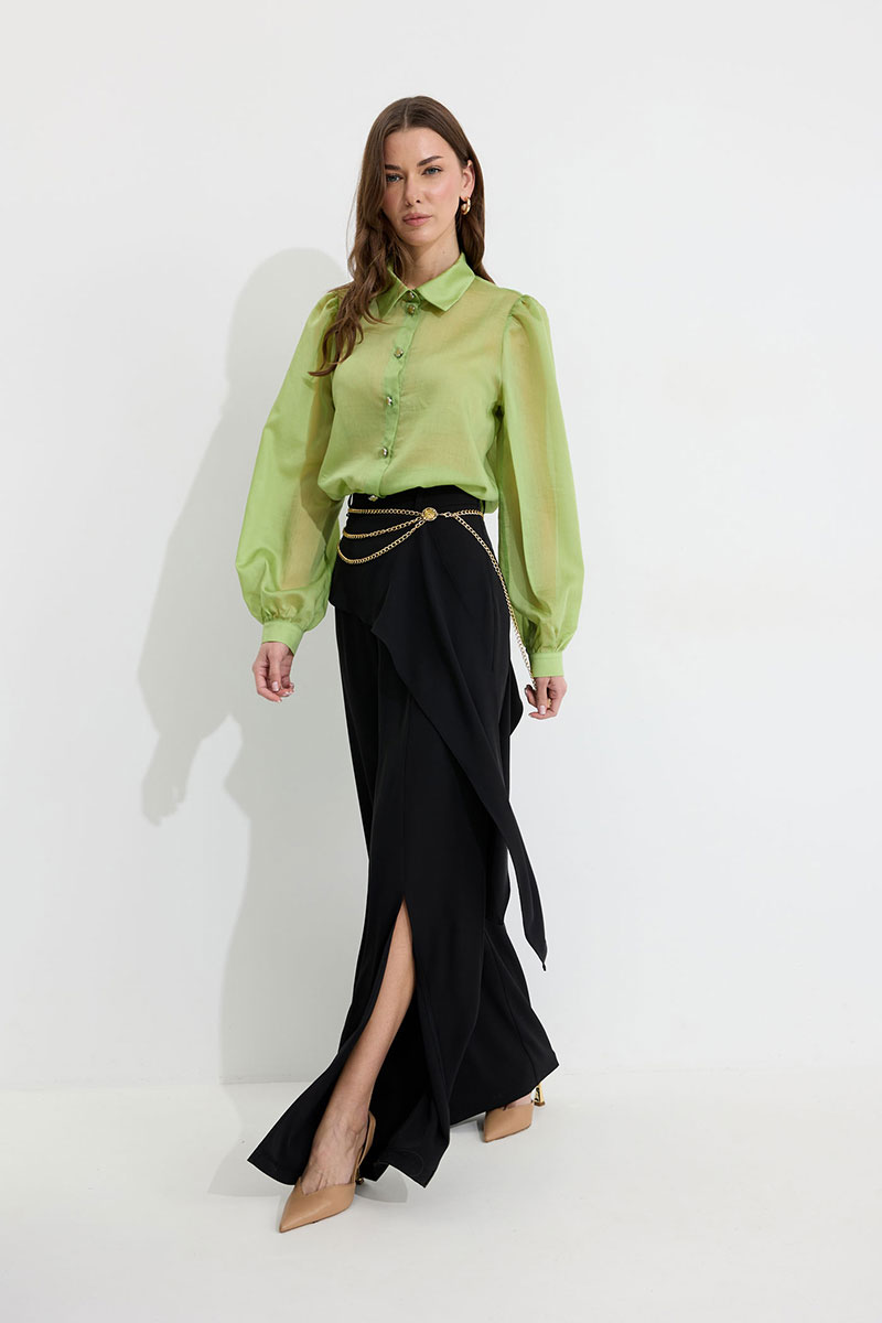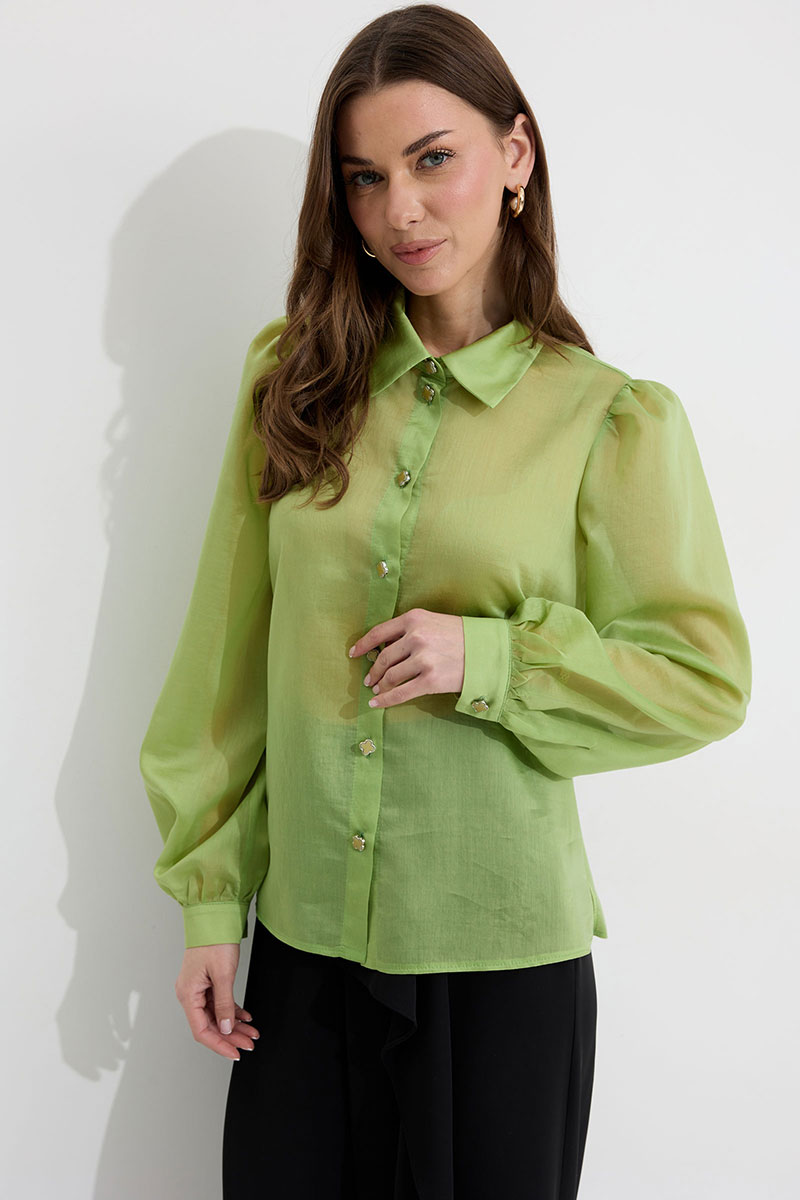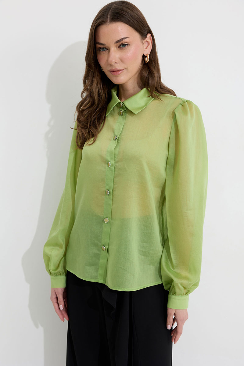 Блузка прямого силуэта из блузочной ткани. Воротник рубашечного типа с застежкой по центру на петли и пуговицы. Рукав со сборкой по окату, по низу манжета с застежкой на петли и пуговицы. По низу в боковых швах разрезы. Обращаем ваше внимание, что фурнитура может отличаться от фото.