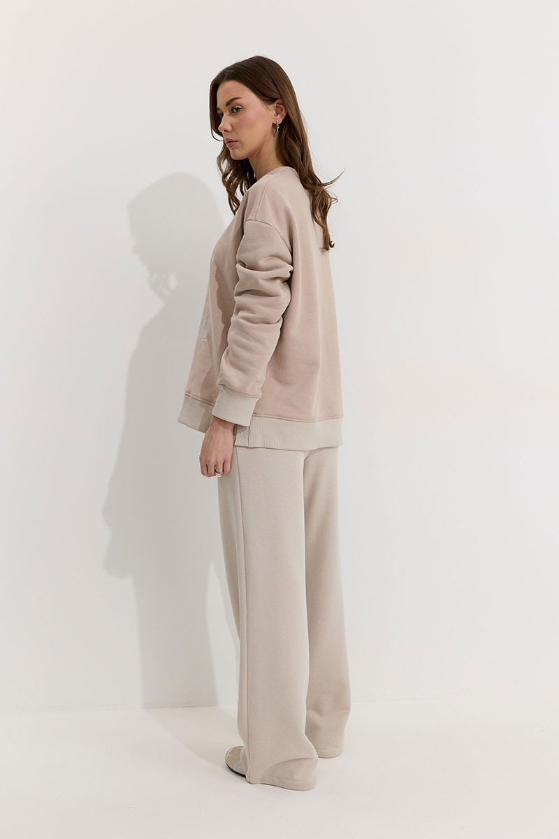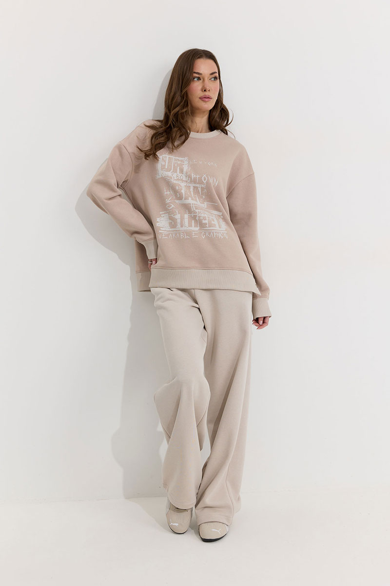 Джемпер прямого силуэта из трикотажного полотна. Горловина округлая. Рукав со спущенной линией плеча, по низу манжета из отделочной ткани. По низу джемпера в боковых швах декоративная шлица с кнопками. По низу джемпера притачной пояс из отделочной ткани. По переду дизайнерская печать. Обращаем ваше внимание, что фурнитура может отличаться от фото.
