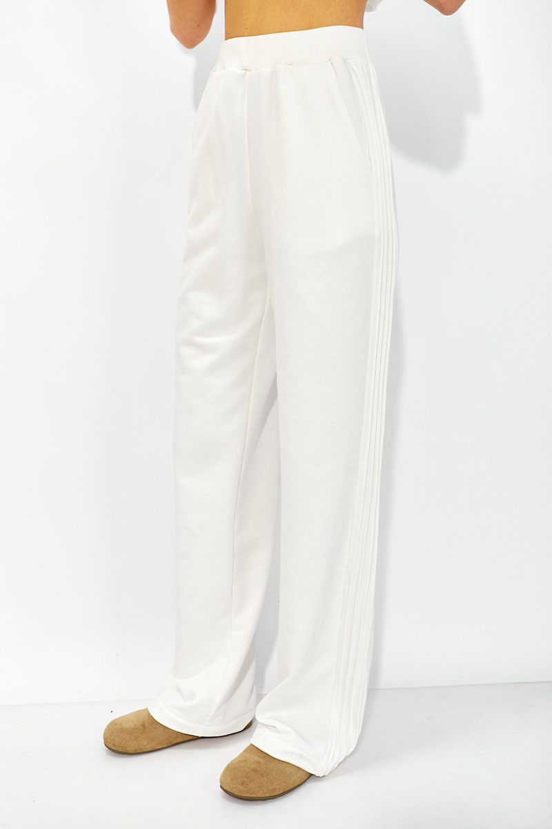 Брюки прямого силуэта расширенные книзу из трикотажного полотна. По верху брюк притачной пояс. По переду наклонные карманы. По бокам притачная планка с декоративными защипами.