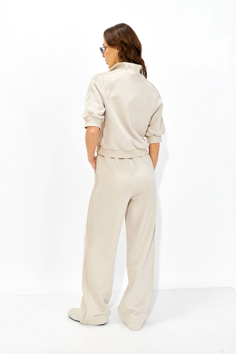 Джемпер прямого силуэта из трикотажного полотна. Воротник-стойка с застежкой по центру на молнию. Рукав реглан с притачной планкой, на которой выполнены декоративные защипы. По низу