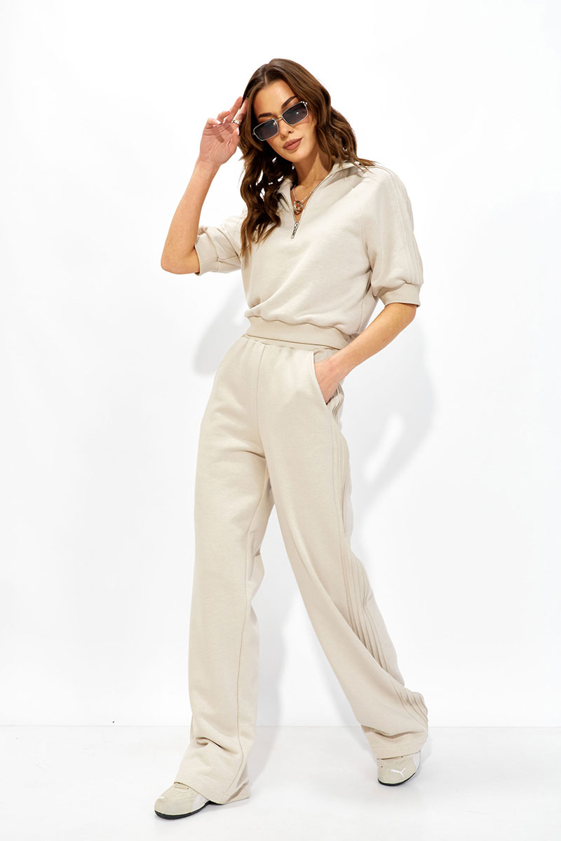 Брюки прямого силуэта расширенные книзу из трикотажного полотна. По верху брюк притачной пояс. По переду наклонные карманы. По бокам притачная планка с декоративными защипами.