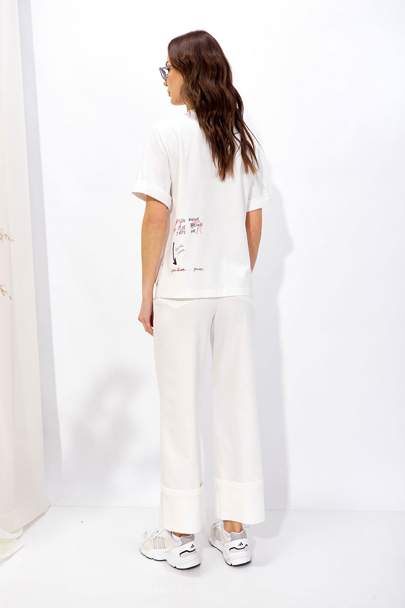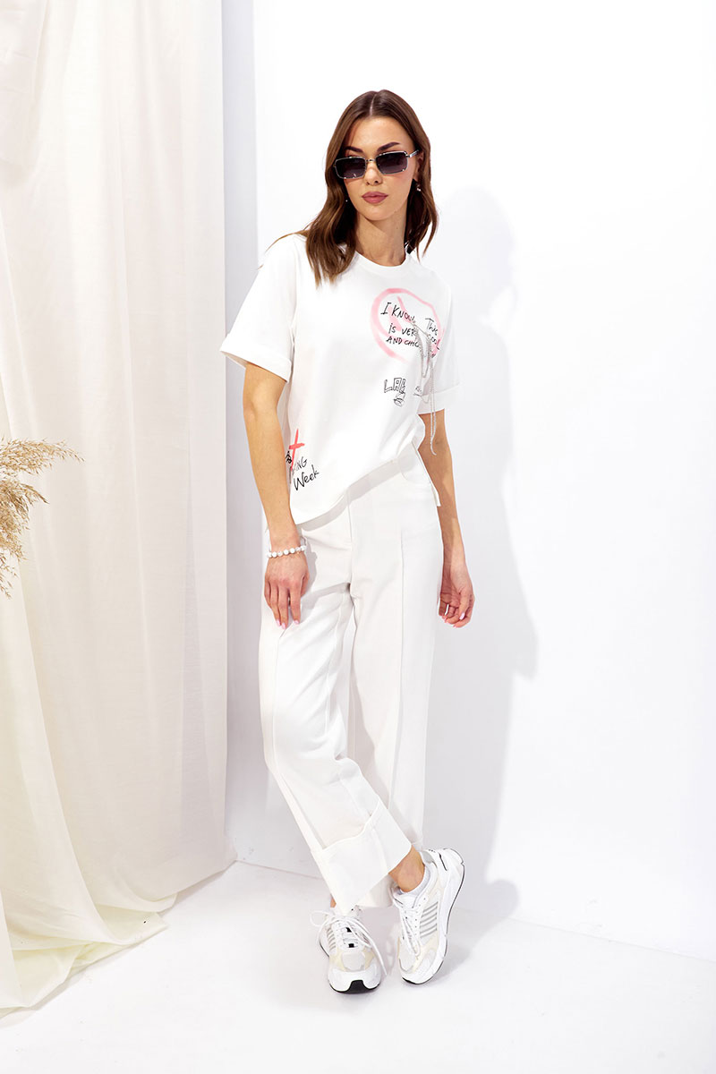 Брюки прямого силуэта из джинсовой ткани. По верху брюк притачной пояс со шлевками для ремня. На передних половинках обработаны карманы, декоративные защипы и застежка молния в среднем шве, на задних –кокетка и карманы. По поясу задних половинок брюк эластичная тесьма (резинка). Обращаем ваше внимание, что фурнитура может отличаться от фото. Декоративный элемент - цепочка в комплектацию не входит!