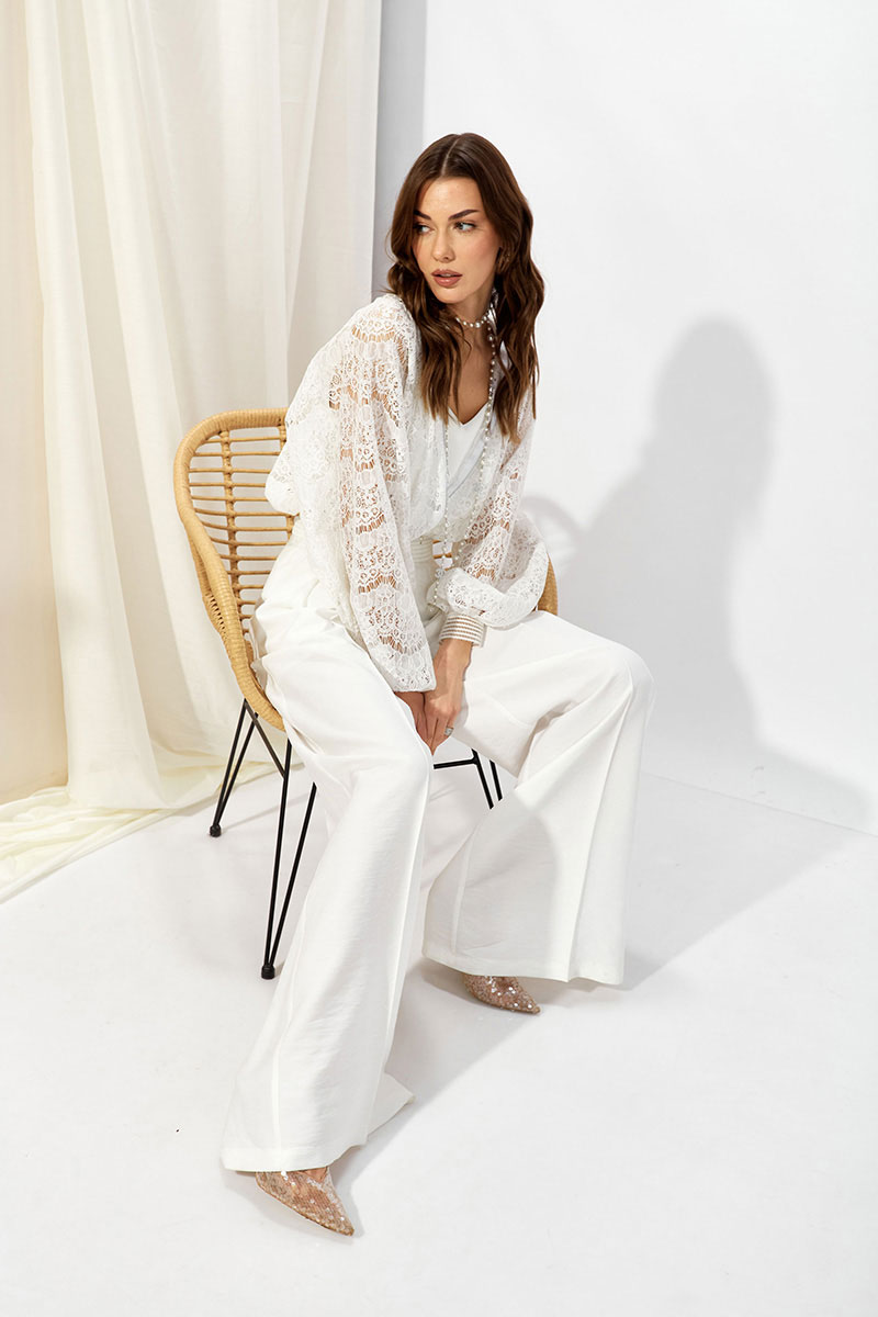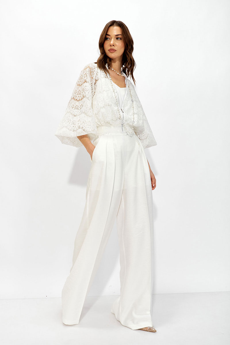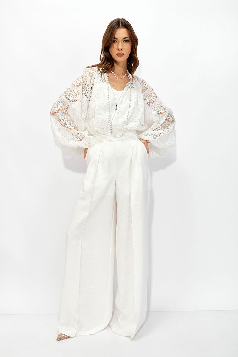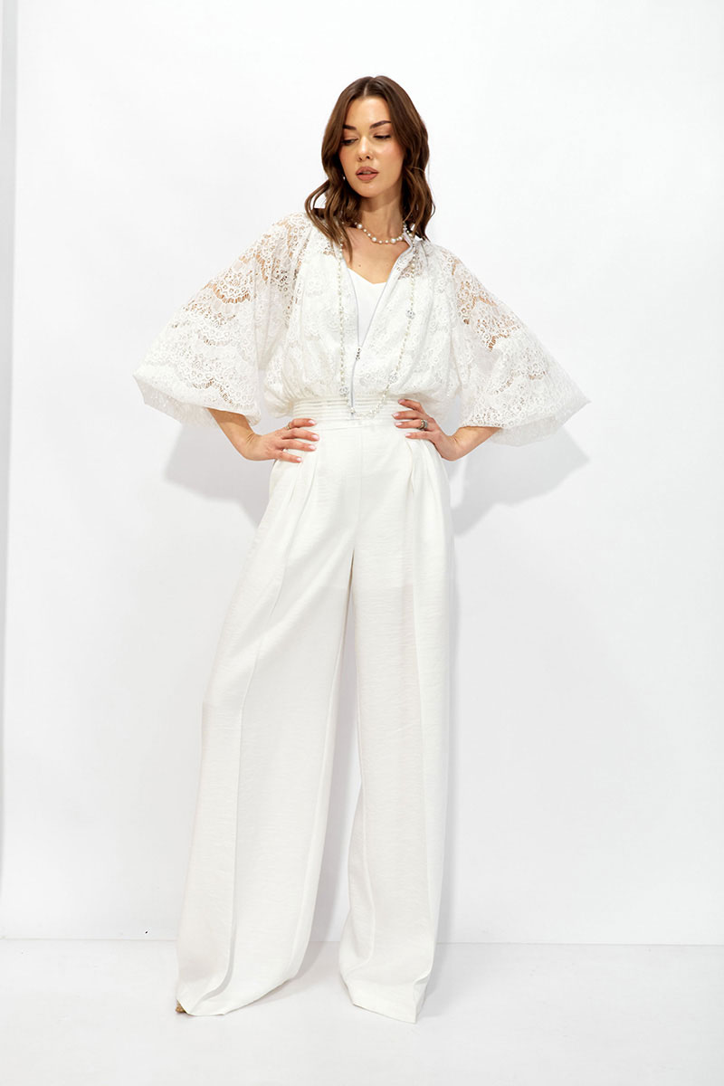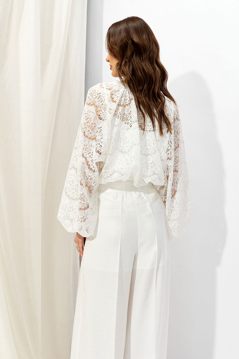 Жакет прямого силуэта из кружева. Горловина обработана декоративной резинкой, по центру застежка на молнию. Рукав со спущенной линией плеча, по низу декоративная резинка. По низу жакета притачная резинка. Обращаем ваше внимание, что фурнитура может отличаться от фото.
