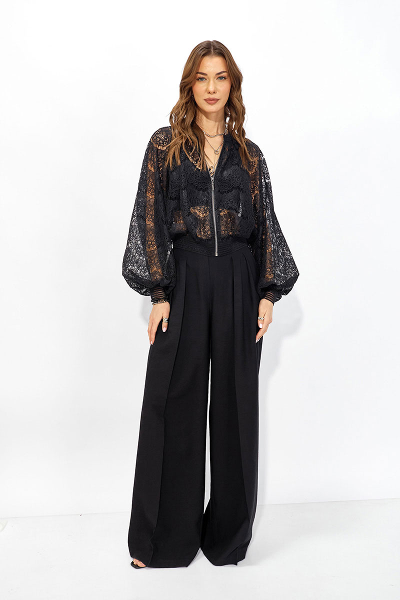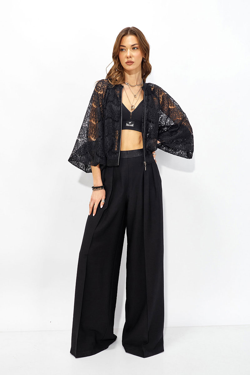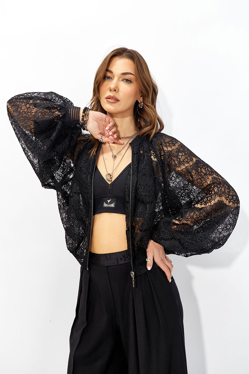 Жакет прямого силуэта из кружева. Горловина обработана декоративной резинкой, по центру застежка на молнию. Рукав со спущенной линией плеча, по низу декоративная резинка. По низу жакета притачная резинка. Обращаем ваше внимание, что фурнитура может отличаться от фото.
