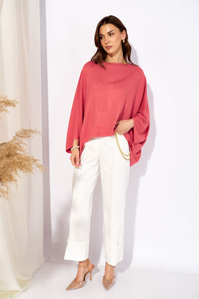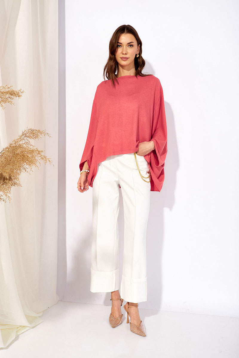 Джемпер свободного кроя из трикотажного полотна с фигурным низом. Горловина –лодочка. Рукав цельнокроеный.