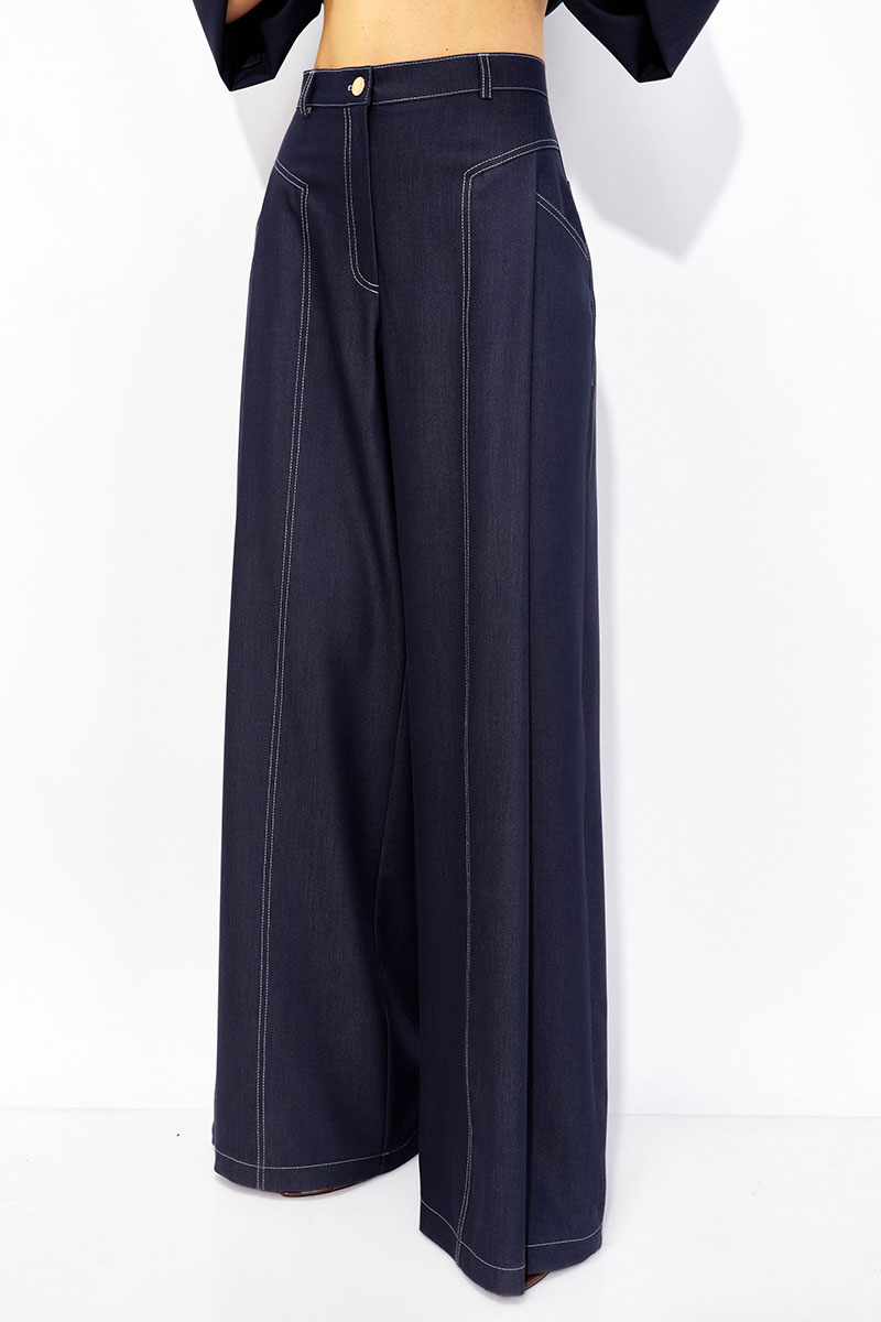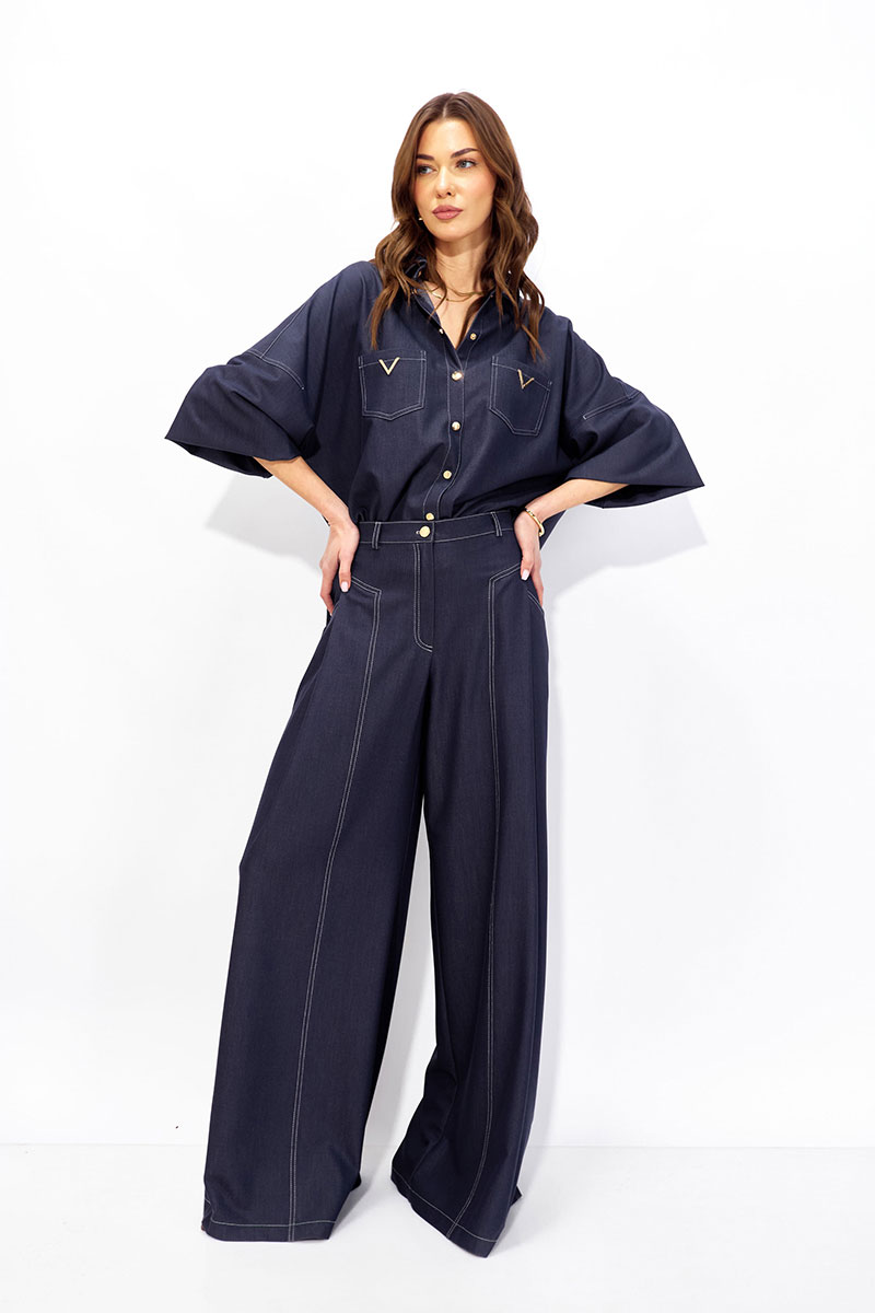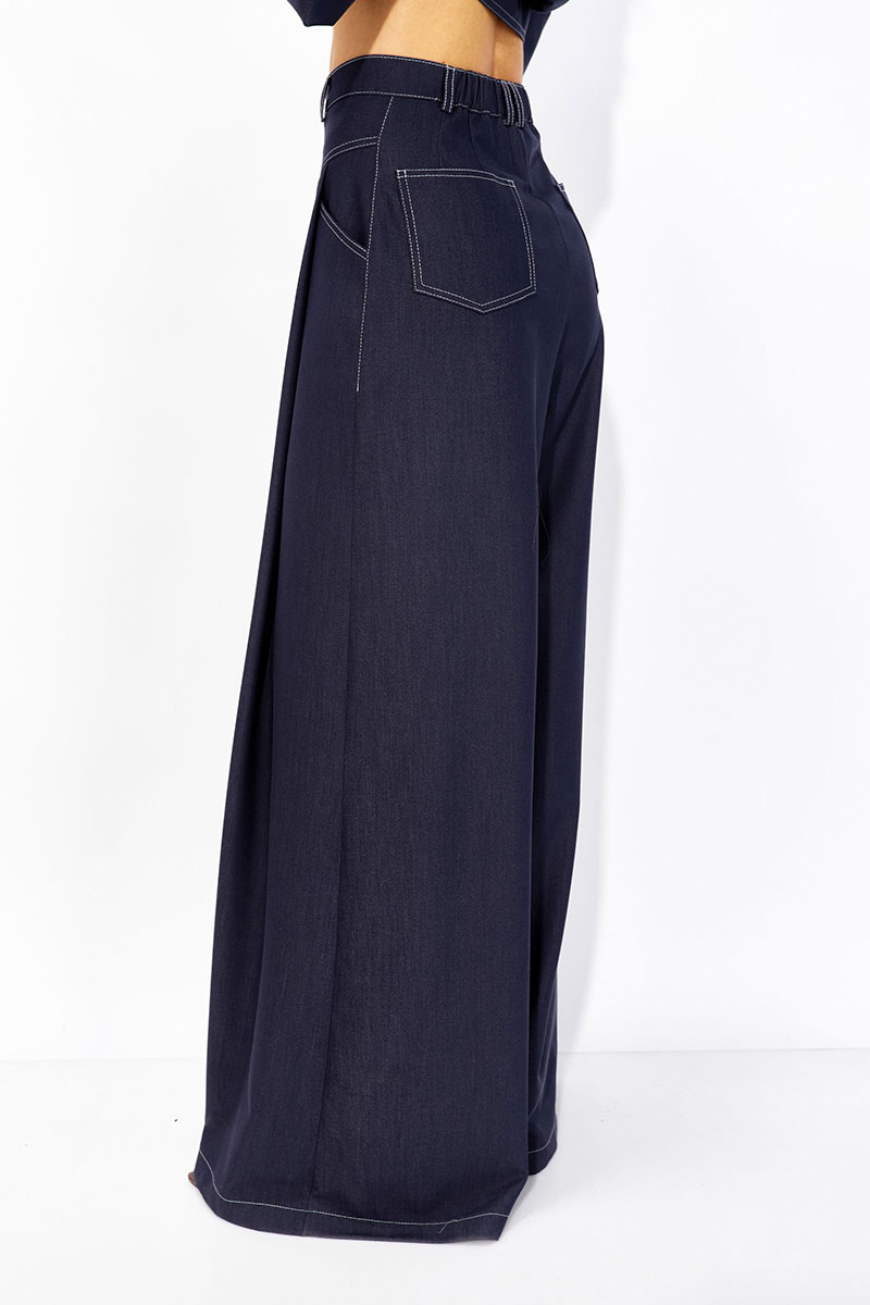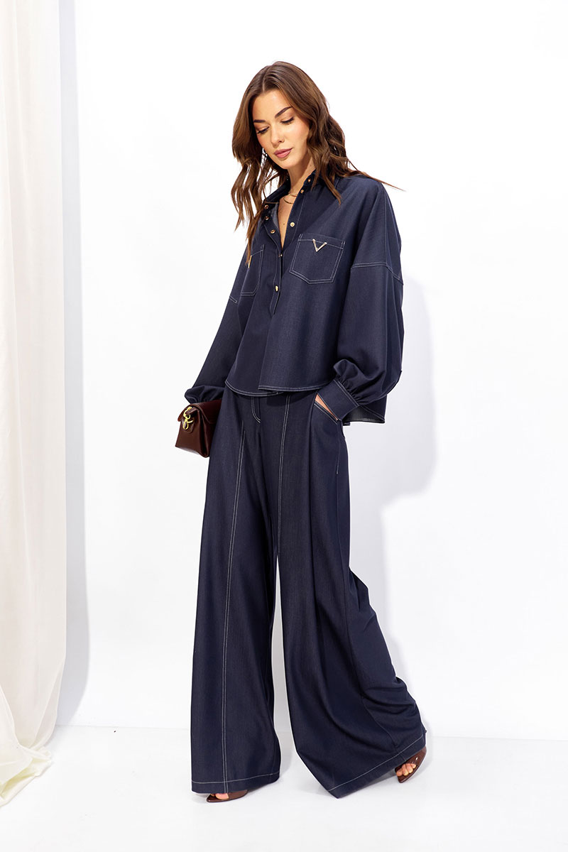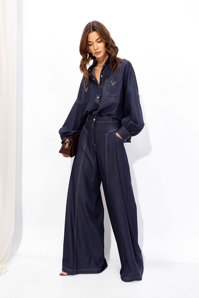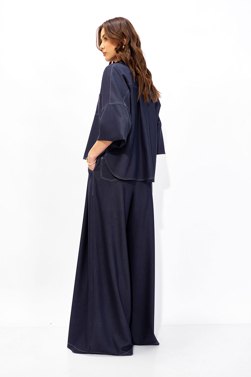 Брюки прямого силуэта расширенные книзу из костюмной ткани под джинс. По верху притачной пояс со шлевками для ремня. На передних половинках обработаны карманы, декоративная складка,