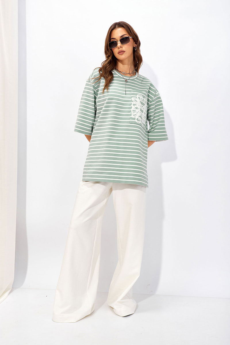 Брюки свободного прямого кроя, расширенные к низу. Выполнены из хлопкового трикотажного полотна молочного цвета. Пояс на резинке, с дополнительной кулисой и шнурком-завязкой. В брюках обработаны боковые карманы с наклонным входом . Обращаем ваше внимание, что фурнитура может отличаться от фото.