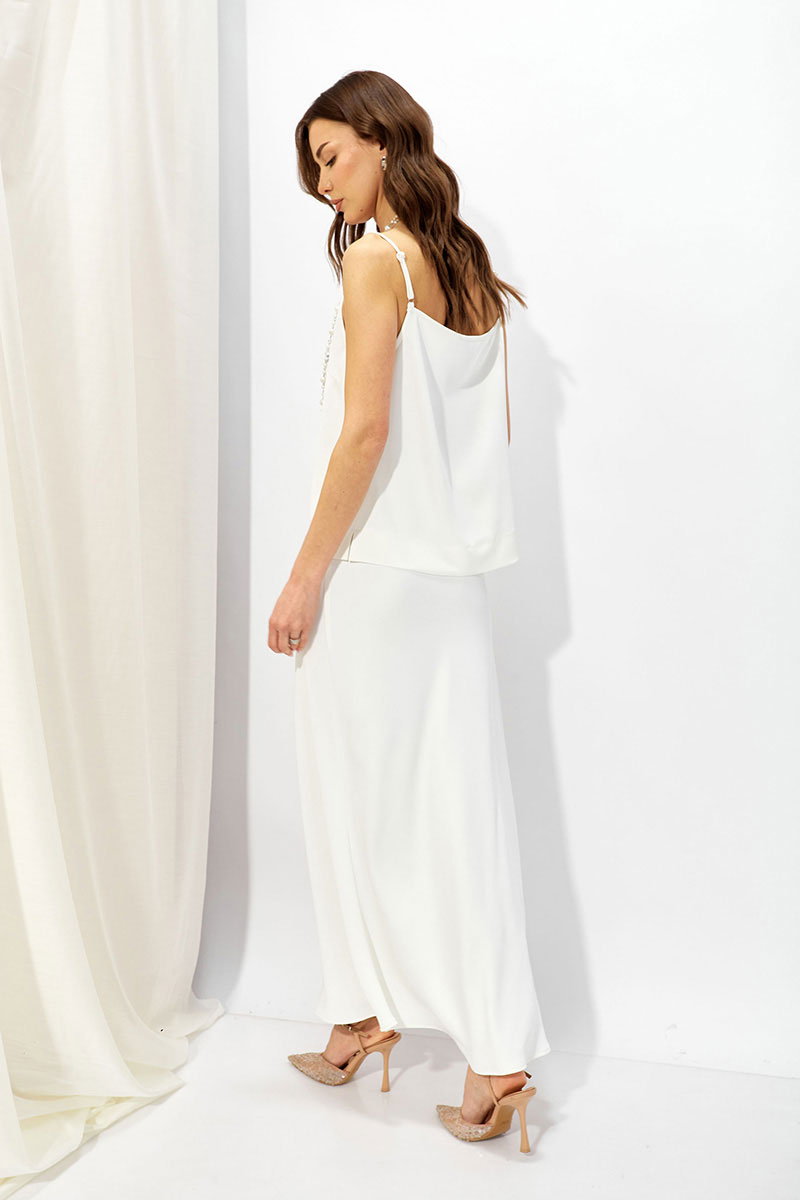 Базовый топ в бельевом стиле из струящейся ткани прямого силуэта с V-образным вырезом на тонких регулируемых бретелях. Его можно носить отдельно или в многослойных образах.