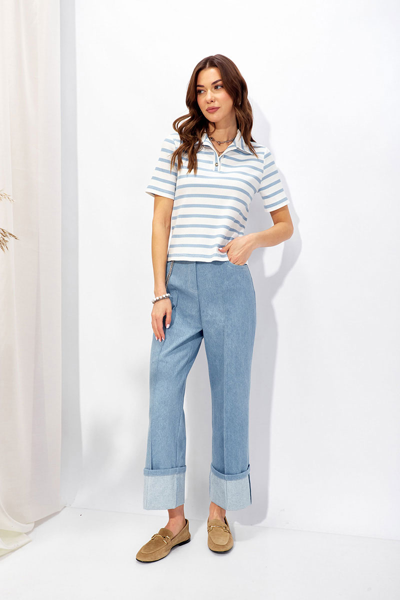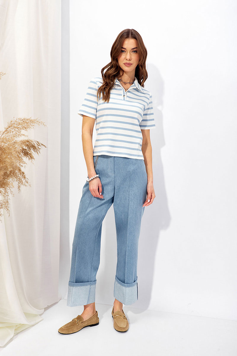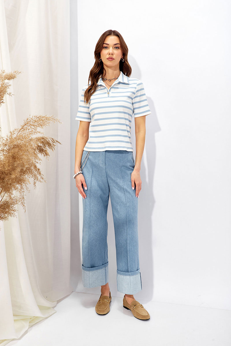 Джемпер полуприлегающего силуэта из трикотажного полотна в полоску. Воротник стояче-отложной, по центру застежка на петли и пуговицы. Рукав втачной, одношовный, выше линии локтя. Обращаем ваше внимание, что фурнитура может отличаться от фото.