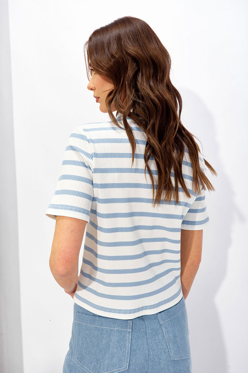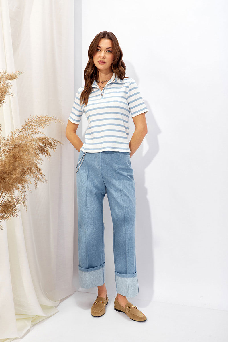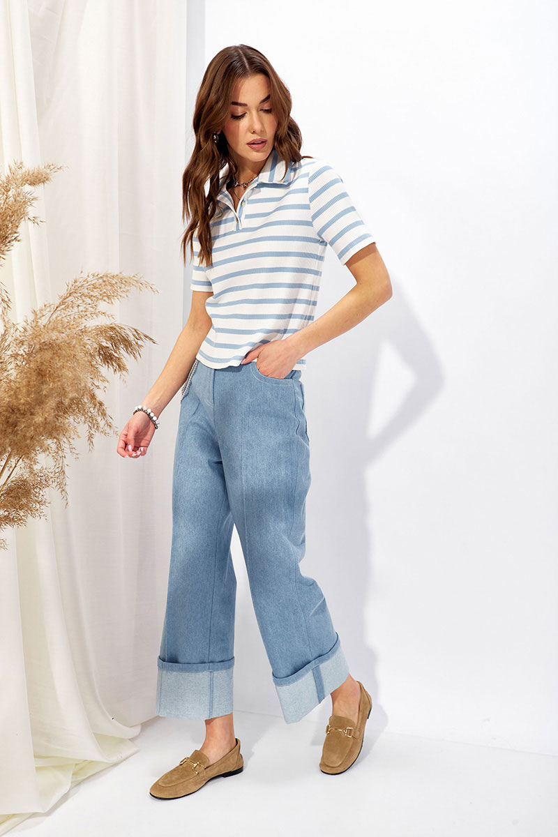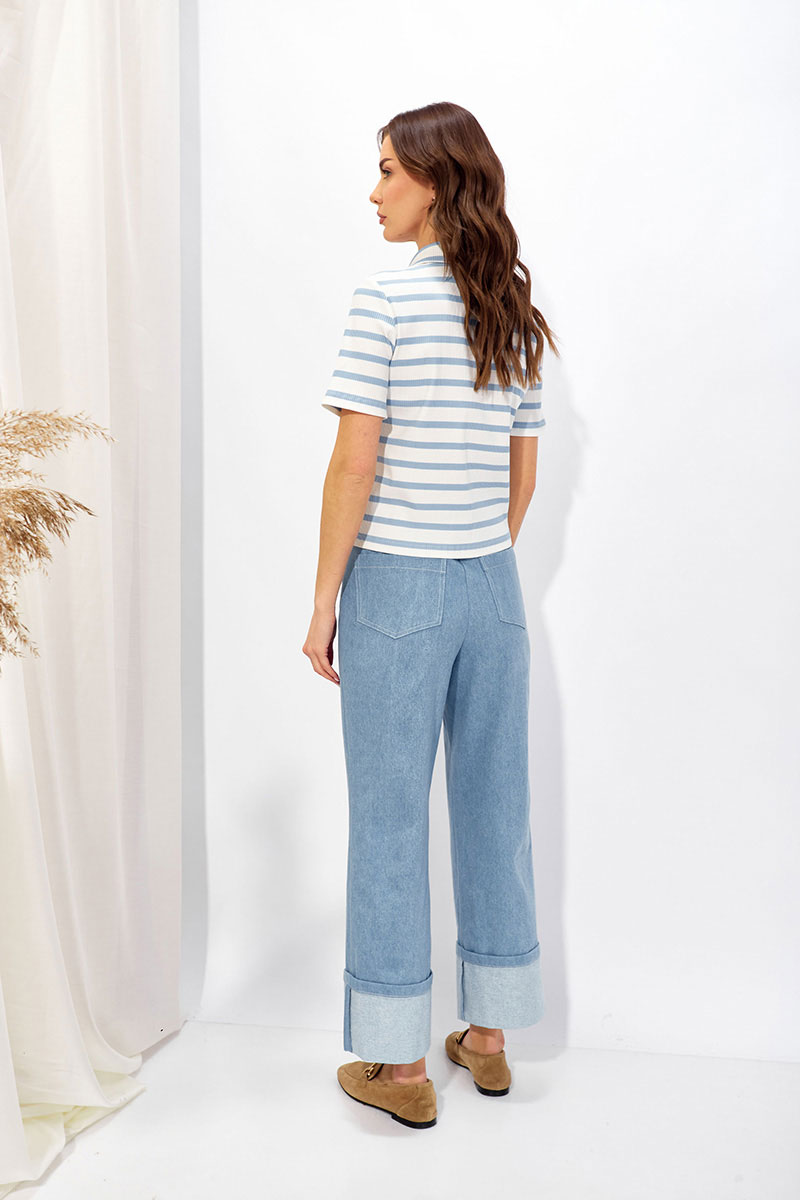 Джемпер полуприлегающего силуэта из трикотажного полотна в полоску. Воротник стояче-отложной, по центру застежка на петли и пуговицы. Рукав втачной, одношовный, выше линии локтя. Обращаем ваше внимание, что фурнитура может отличаться от фото.
