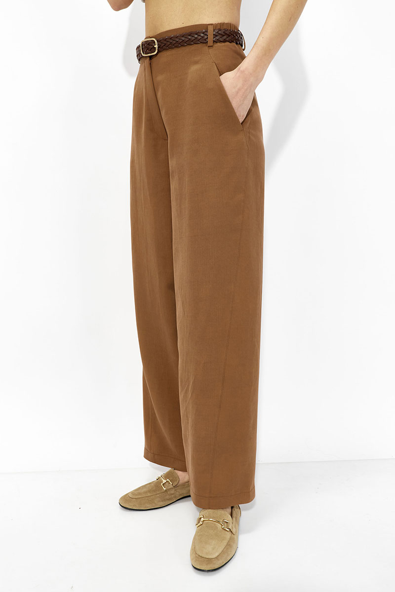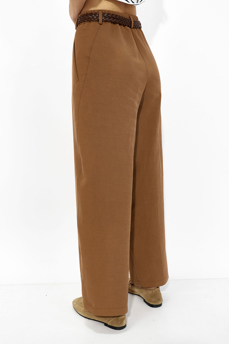Брюки прямого, расширенного силуэта, слегка зауженные к низу. Пояс притачной, частично с резинкой по переду и спинке и с застежкой спереди на молнию и петлю-пуговицу. Боковые швы