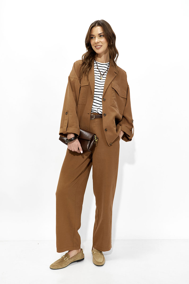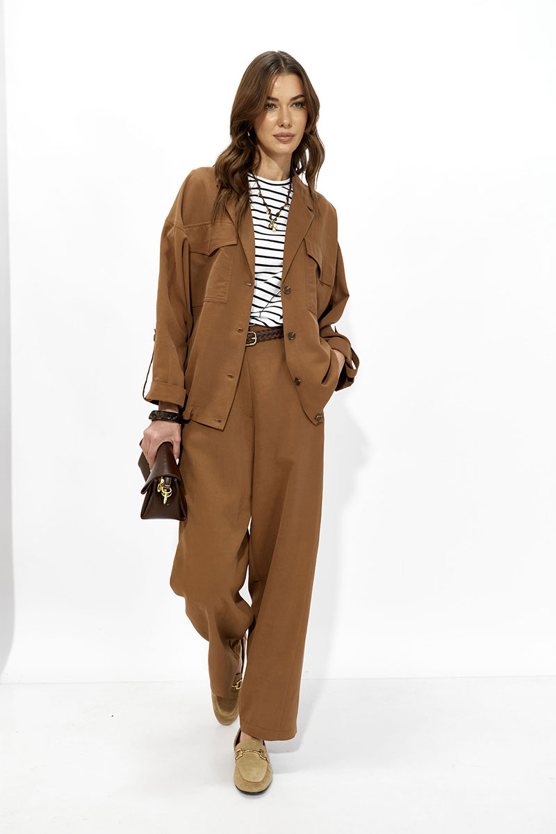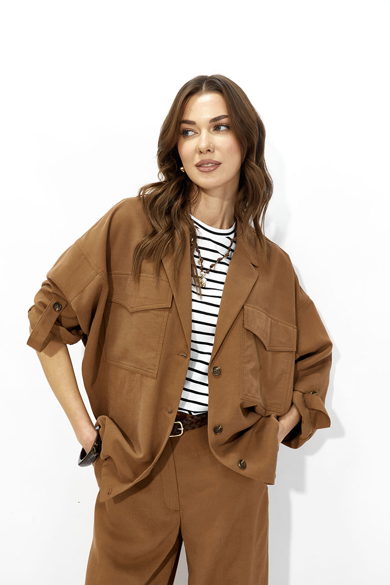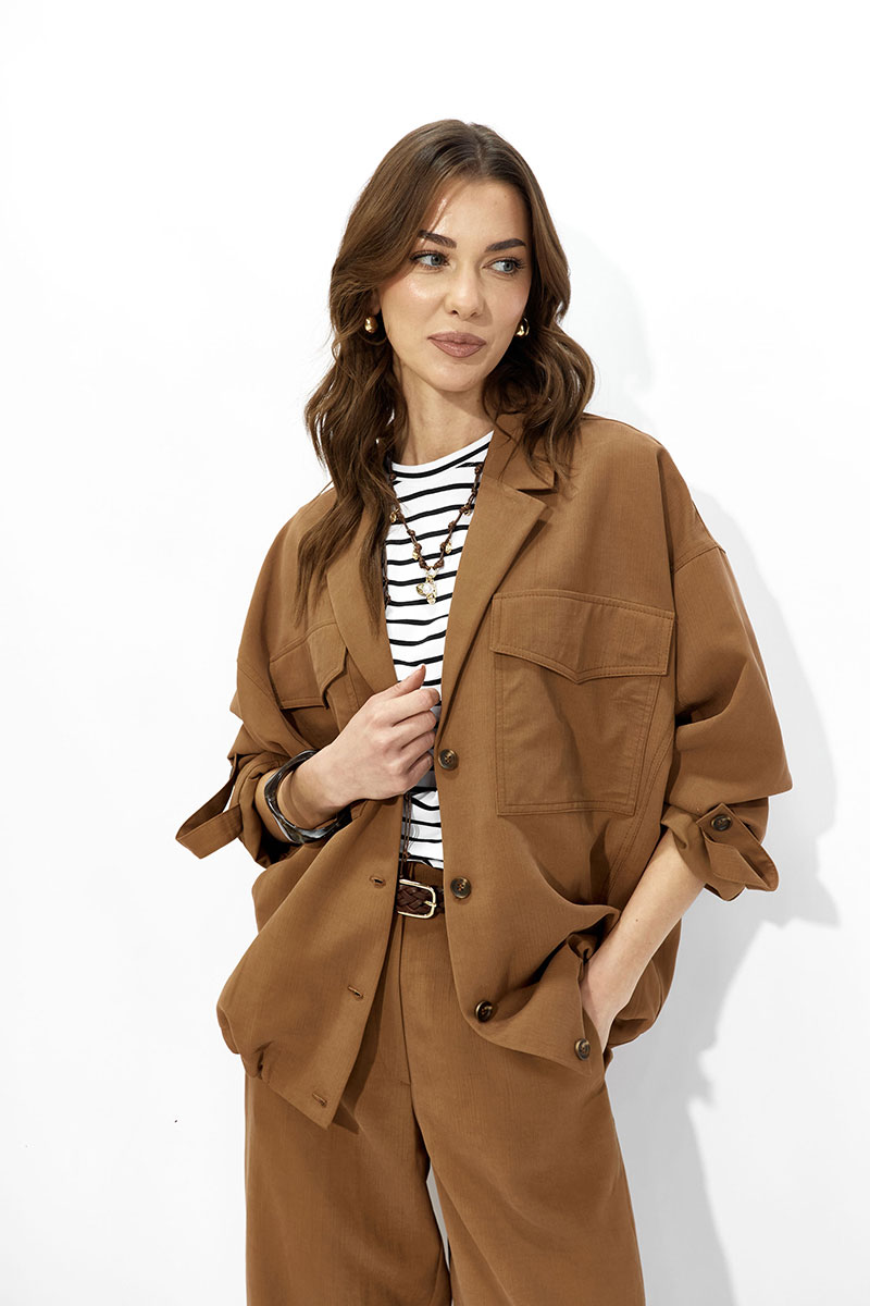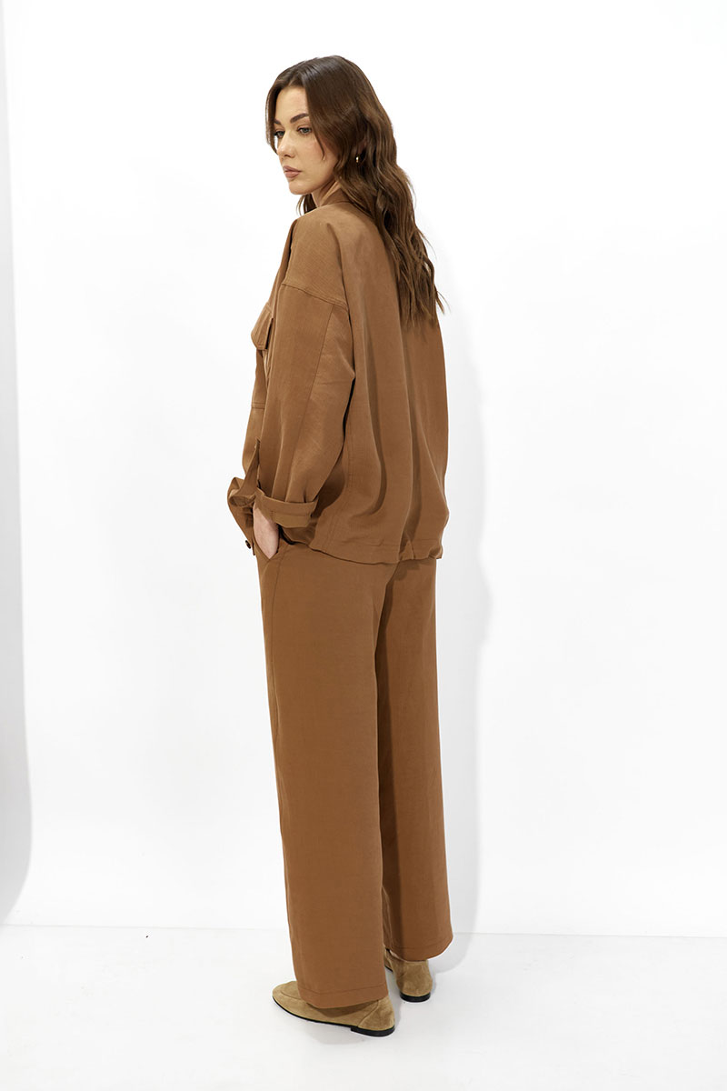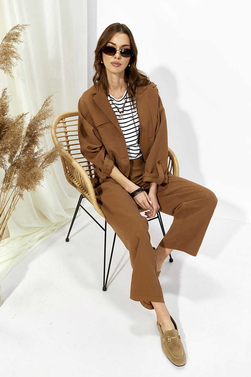 Костюм свободного кроя из вискозной ткани. Жакет свободного, расширенного силуэта с центральной бортовой застежкой на петли и пуговицы. Рукав комбинированный на основе цельнокроеного.