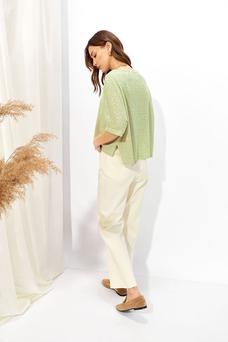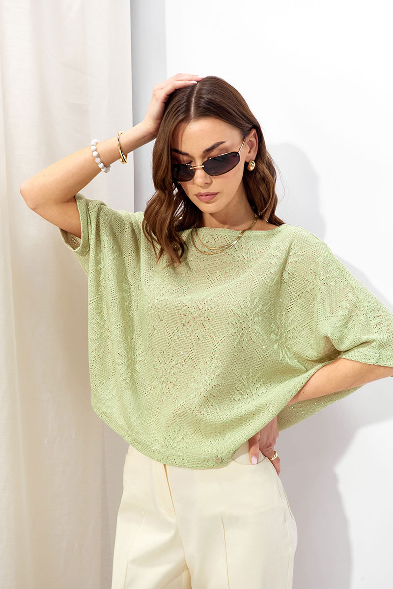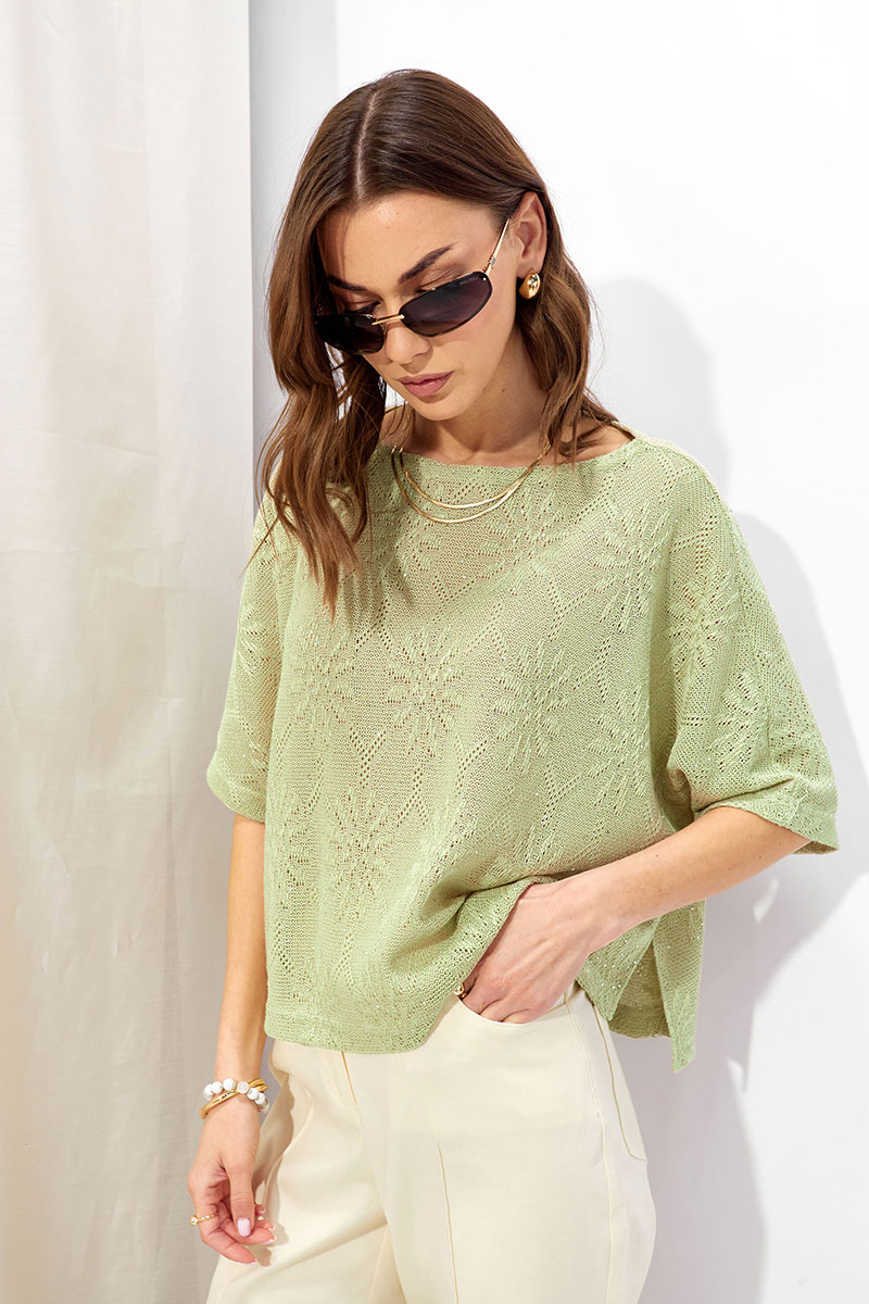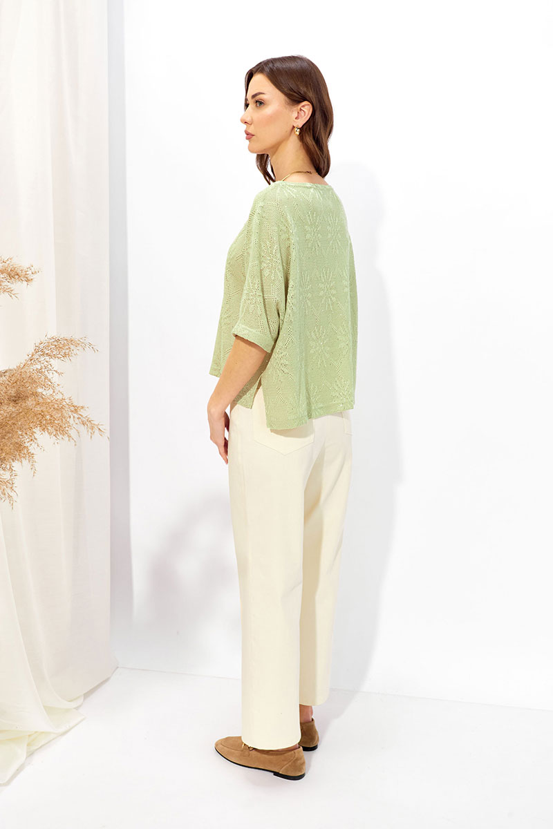 Джемпер покроя “летучая мышь” слегка зауженный книзу из трикотажного полотна. Горловина-лодочка. По низу джемпера в боковых швах разрезы, спинка длиннее переда.