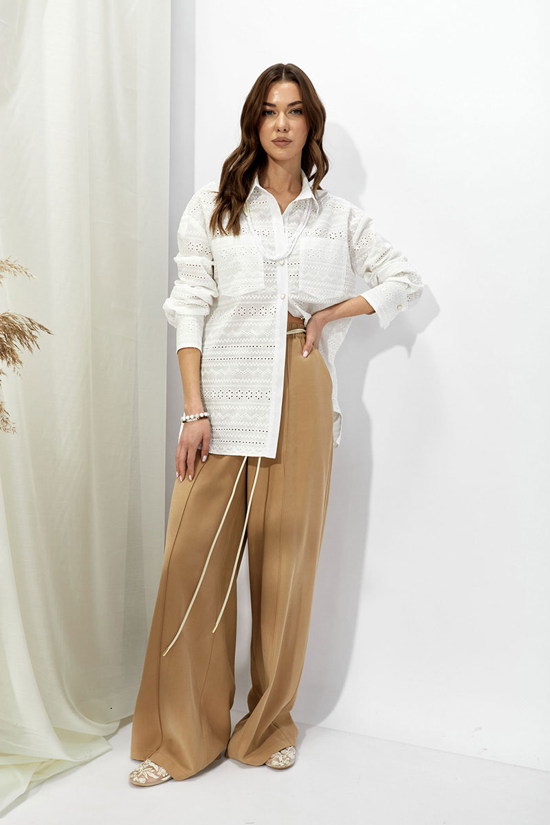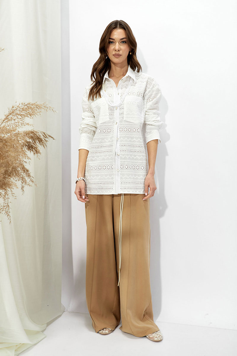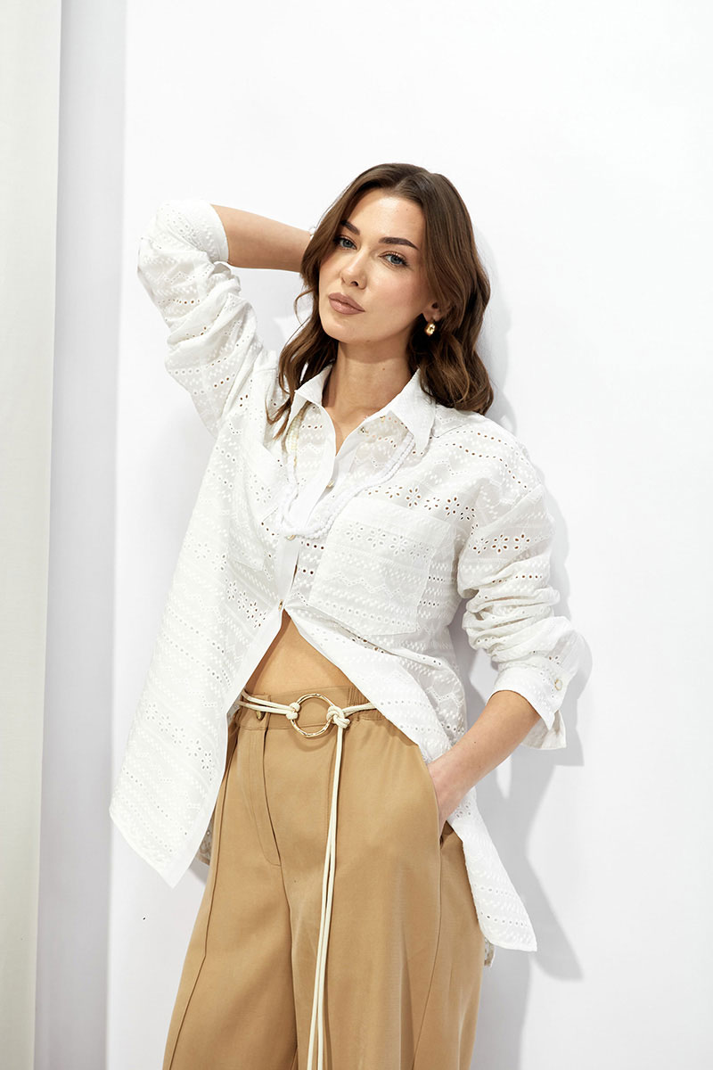 Блузка прямого силуэта из ришелье. Воротник рубашечного типа с центральной застежкой на петли и пуговицы. Рукав втачной длинный, по низу манжета на петли и пуговицы. По переду нагрудные карманы. На спинке кокетка и складки. По низу блузки в боковых швах разрезы. Обращаем ваше внимание, что фурнитура может отличаться от фото.
