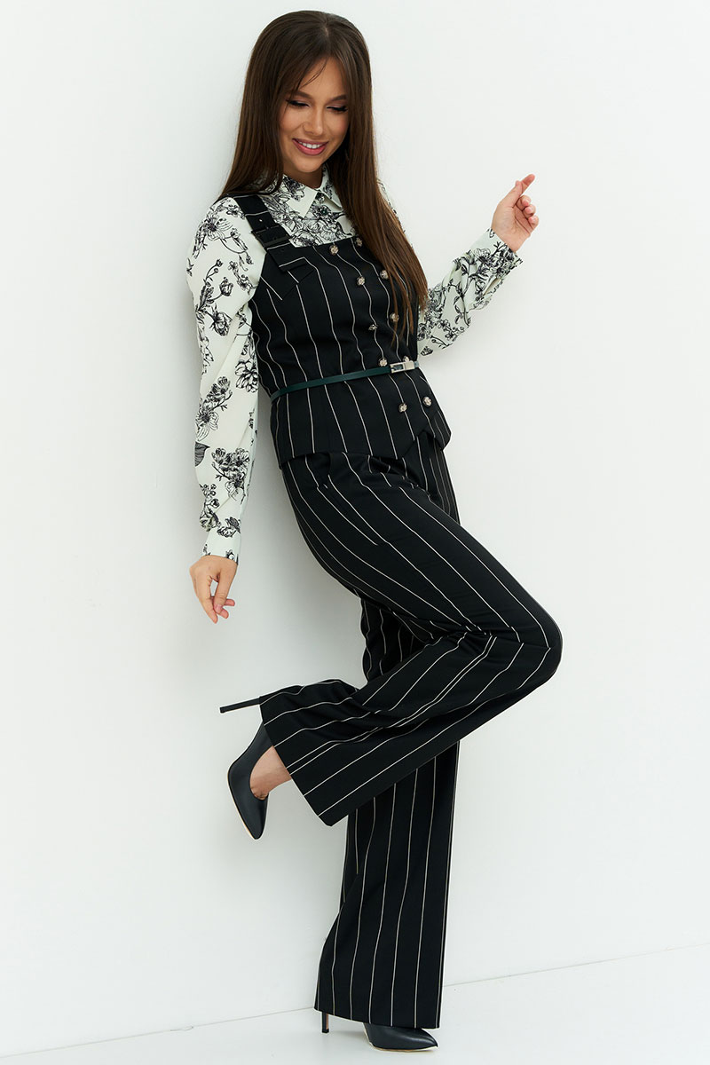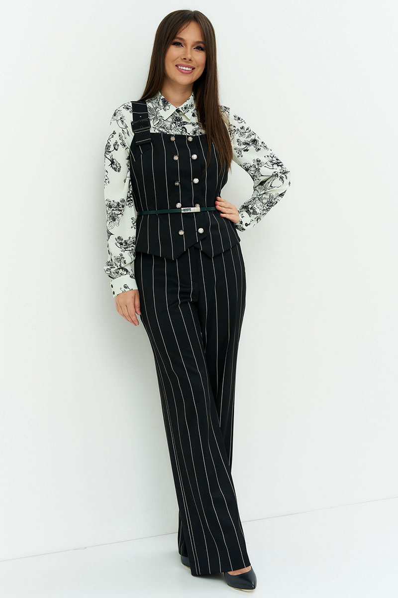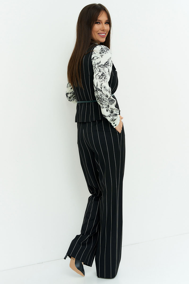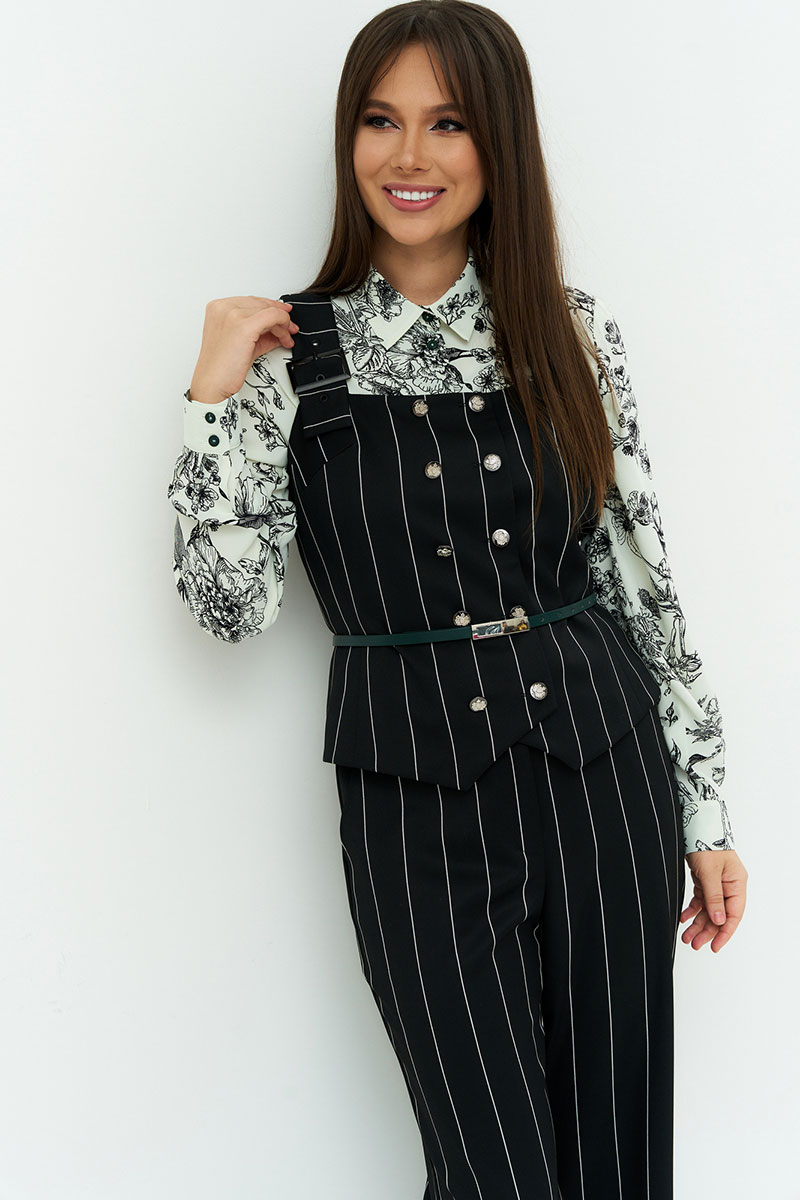 - Состав: жилет и брюки: ПЭ 75%; вискоза 23%; эластан 2%; блуза: ПЭ 60%; вискоза 38%; эластан 2%