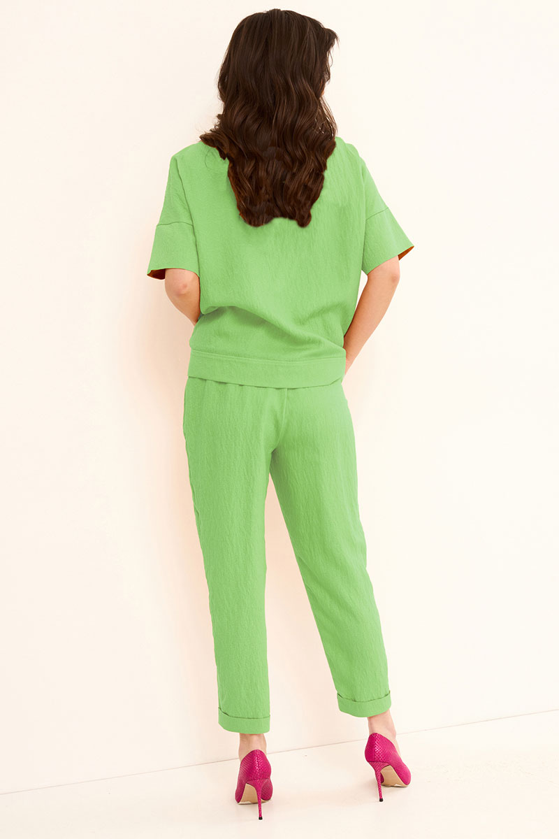 Брюки свободного кроя, слегка заужены к низу, с притачным поясом. Пояс дополнен эластичной тесьмой. Посадка средняя. Брюки дополнены боковыми карманами. Застежка на пуговицу и молнию.