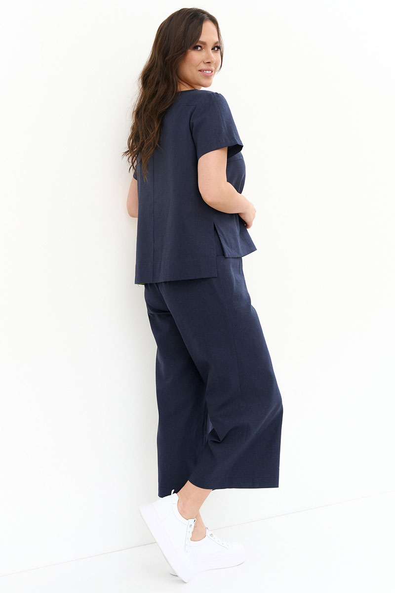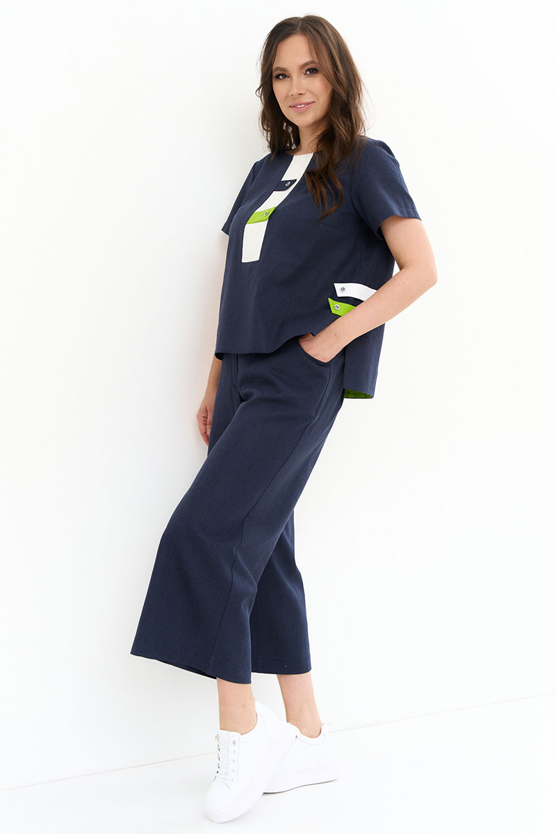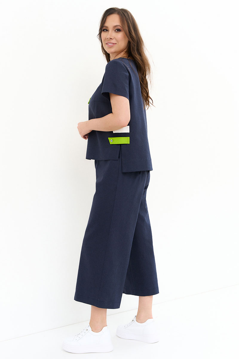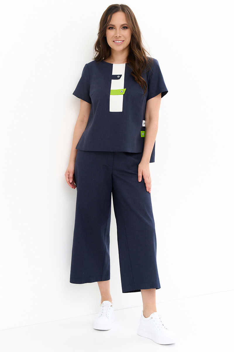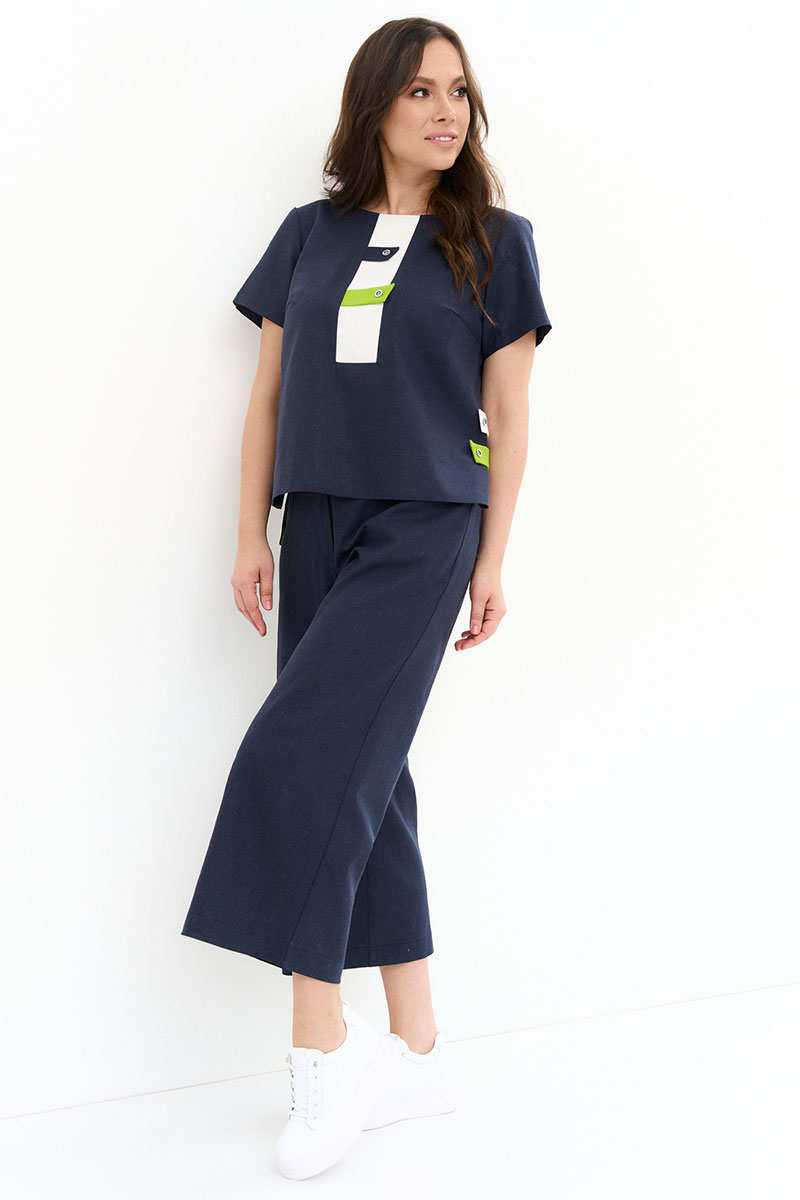 Стильный и комфортный комплект из блузы и укороченных брюк. Выполнен из льняного полотна, приятного к телу.