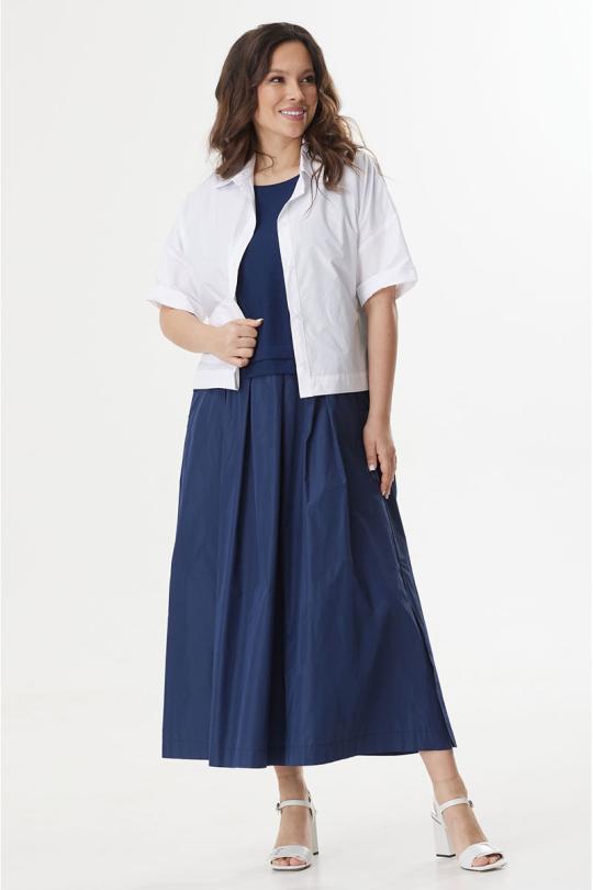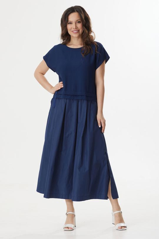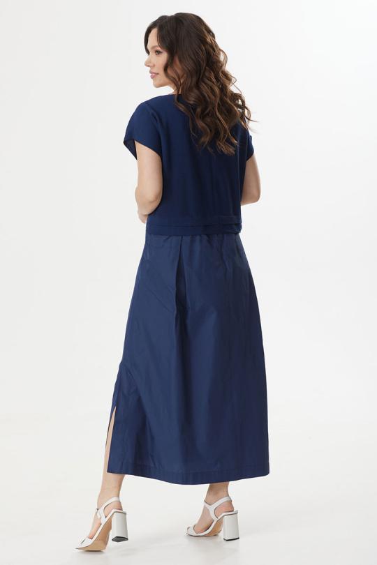 Платье А-образного силуэта с отрезной талией. Верх платья выполнен из поливискозной ткани. Низ платья выполнен из тонкой тафты, которая прекрасно держит форму. Рукав цельнокроеный, короткий. По спинке застежка на потайную молнию. Юбка платья дополнена двумя боковыми разрезами.