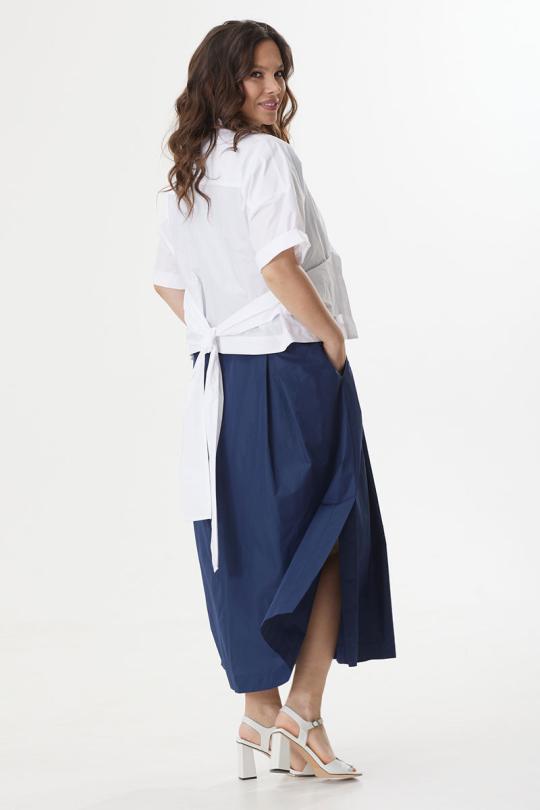 Блуза свободного кроя с центральной застежкой на пришивные пуговицы. Дополнена пришивным поясом, который завязывается в красивый бант, либо другим способом. Горловина обработана отложным воротником. Рукав втачной, слегка спущен. Выполнена блуза из тонкой тафты белого цвета. Ткань комфортная к телу и имеет отличный визуал.
