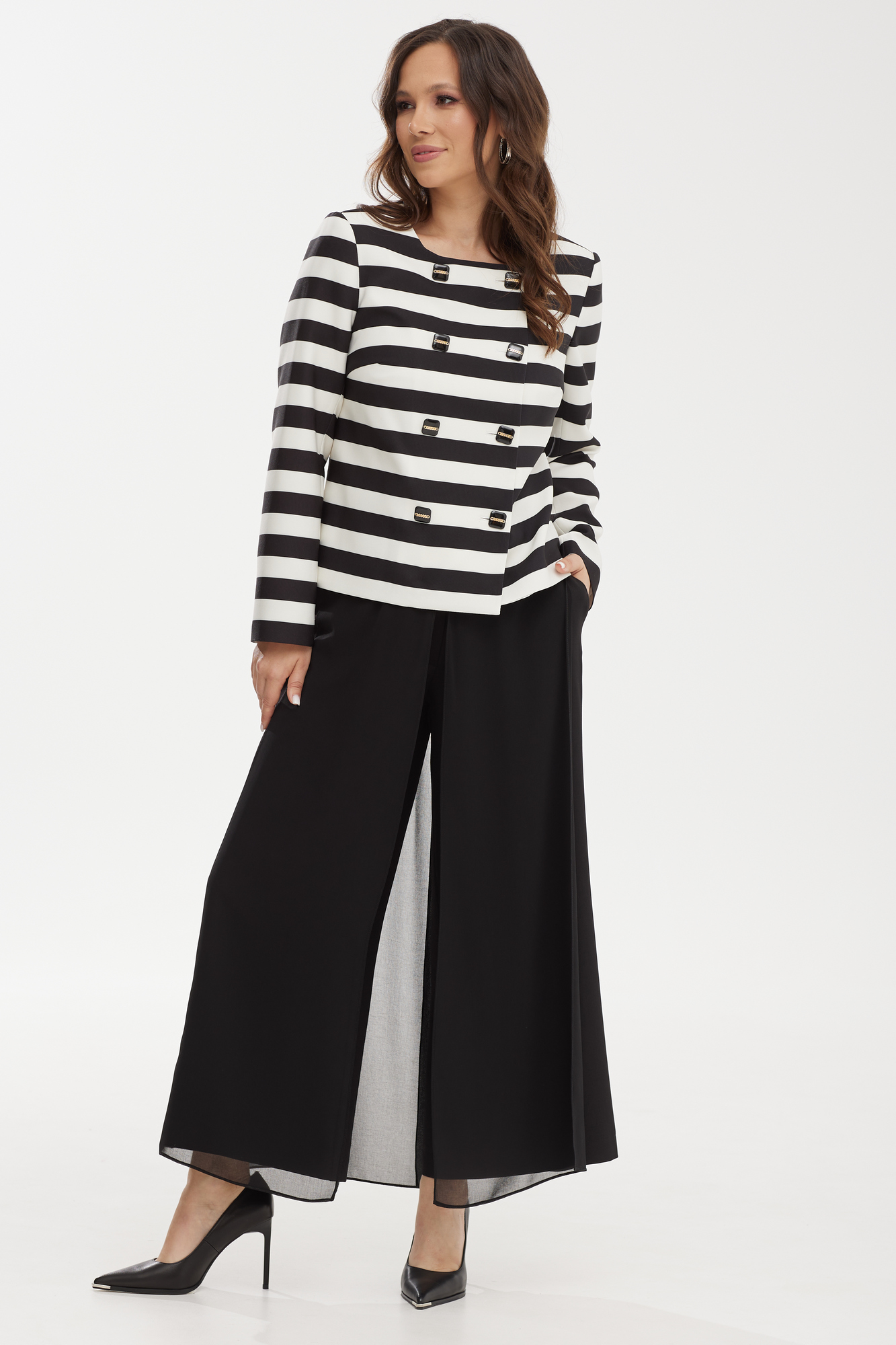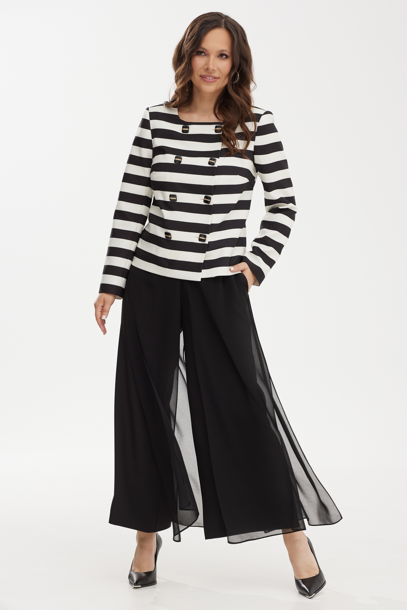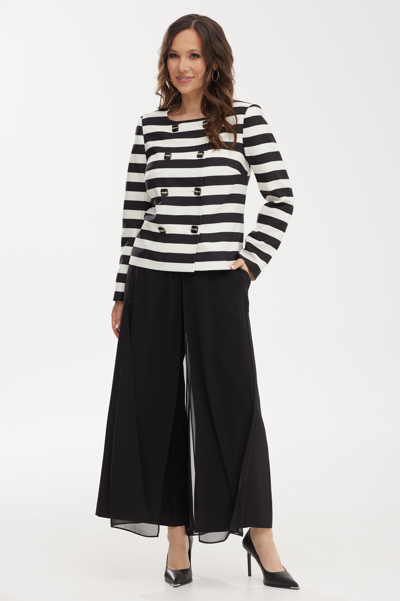 Нарядный комплект из жакета и брюк. Двубортный жакет полуприталенного силуэта, на подкладке. Рукав длинный, втачной. Центральная застежка на красивые пришивные пуговицы. Брюки кюлоты прямого кроя с притачным поясом, дополненным эластичной тесьмой. Застежка гульфик на пуговицу и молнию. Брюки дополнены удобными боковыми карманами. Неповторимый шарм брюками придают элементы из шифона, которые закреплены по шву пояса и свободно и эффектно развеваются при движении и ходьбе.
