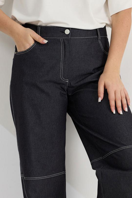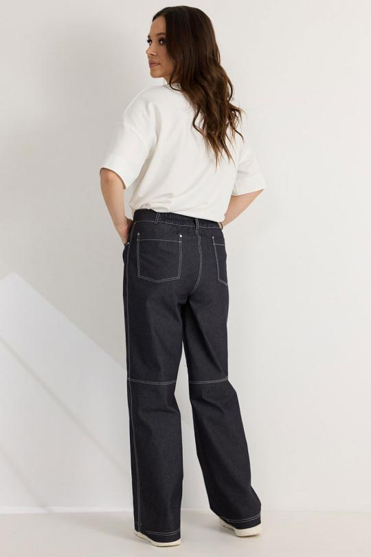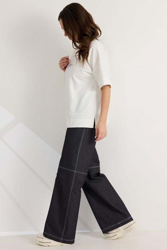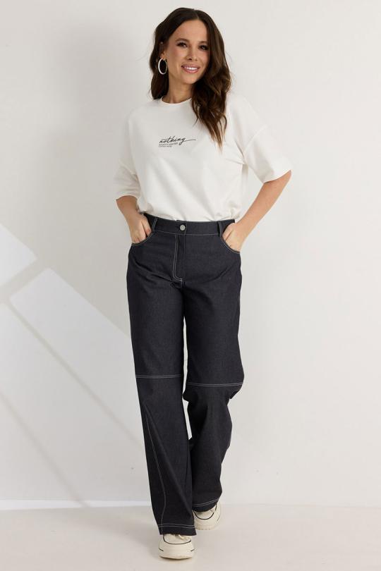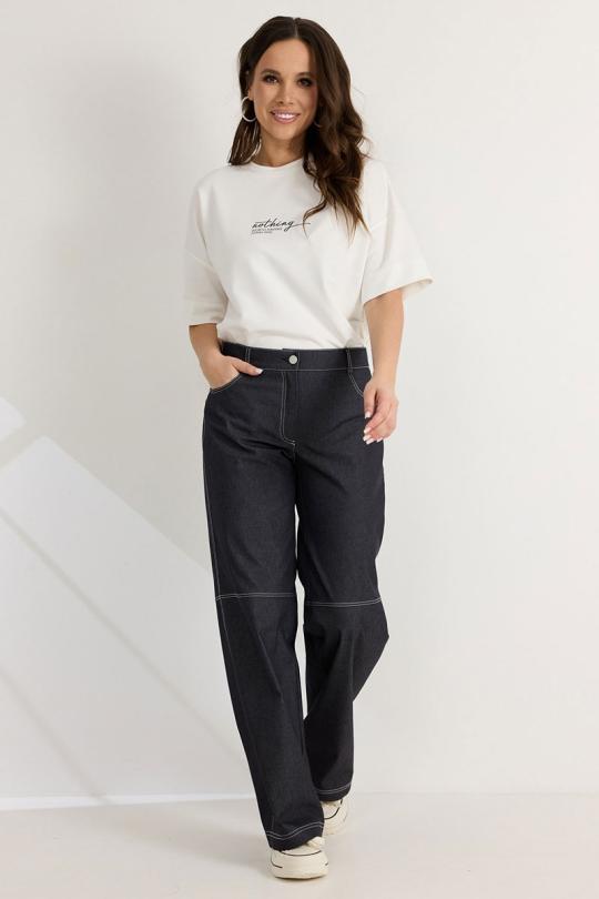 Брюки прямого свободного кроя. Выполнены из джинсового полотна средней плотности. Брюки дополнены декоративными строчками вдоль швов, а также металлическими заклепками. Пояс притачной, по спинке дополнен эластичной тесьмой. Спереди застежка гульфик с молнией и пуговицей. Брюки дополнены боковыми карманами, а также накладными карманами сзади.