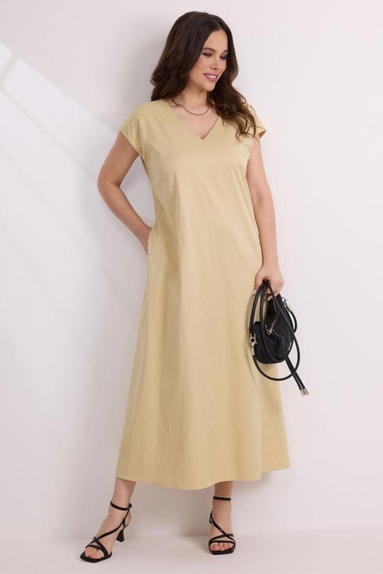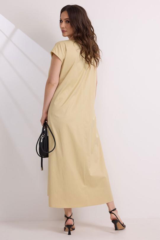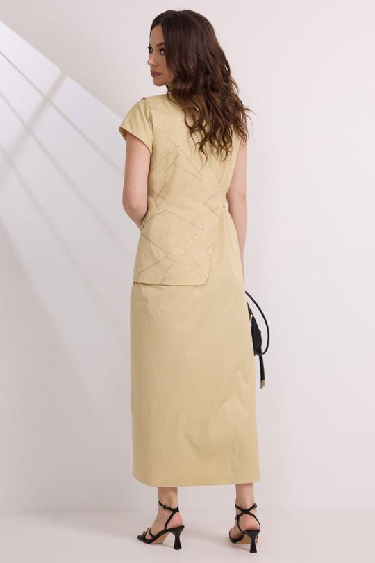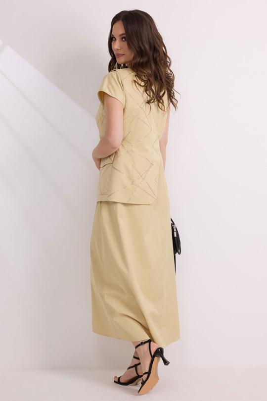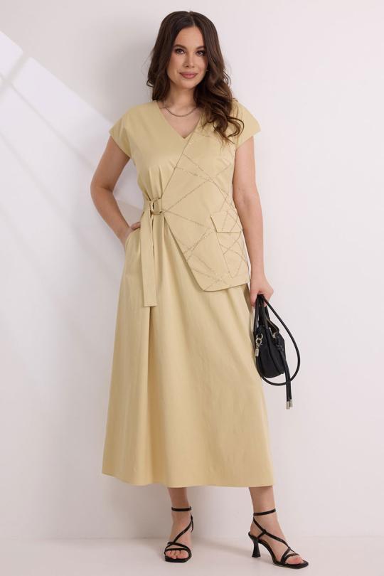Платья свободного А-образного силуэта с коротким рукавом. Выполнено из комфортной, держащей форму, ткани. V-образный вырез горловины. По боковым швам полатье дополнено функциональными карманами. Платье дополнено съемным полужилетом. Выполнен из такой же ткани, что и платье, но дополнен пришивными линиями из пайеток.