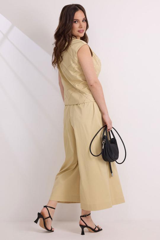 Брюки кюлоты свободного кроя с притачным поясом, дополненным эластичной тесьмой. Застежка гульфик на молнию и пуговицу. Выполнены брюки из комфортной, держащей форму ткани. Дополнены удобными боковыми карманами.