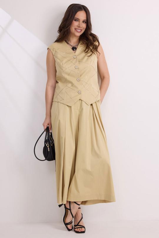 Жилет однобортный полуприлегающего силуэта, на подкладке, с центральной застежкой на пришивные пуговицы. Выполнен из комфортной, держащей форму ткани, дополненной линиями из пришивных пайеток.