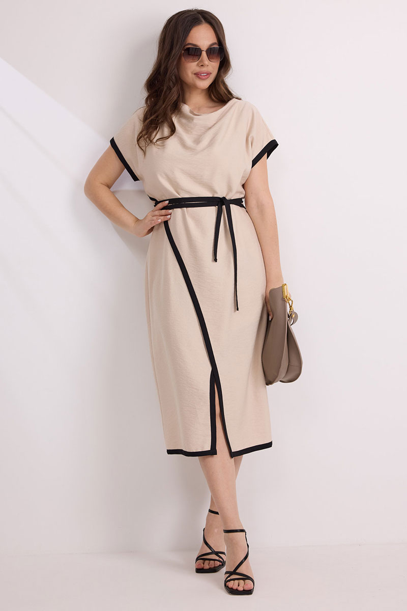 Элегантное платье свободного кроя. Выполнено из комфортной поливискозной ткани с легким эффектом сжатости. Низ платья выполнен с эффектом запаха. Рукав цельнокроеный, короткий. По спинке застежка на потайную молнию. Приталено по талии съемным поясом. Платье дополнено контрастной отделкой.