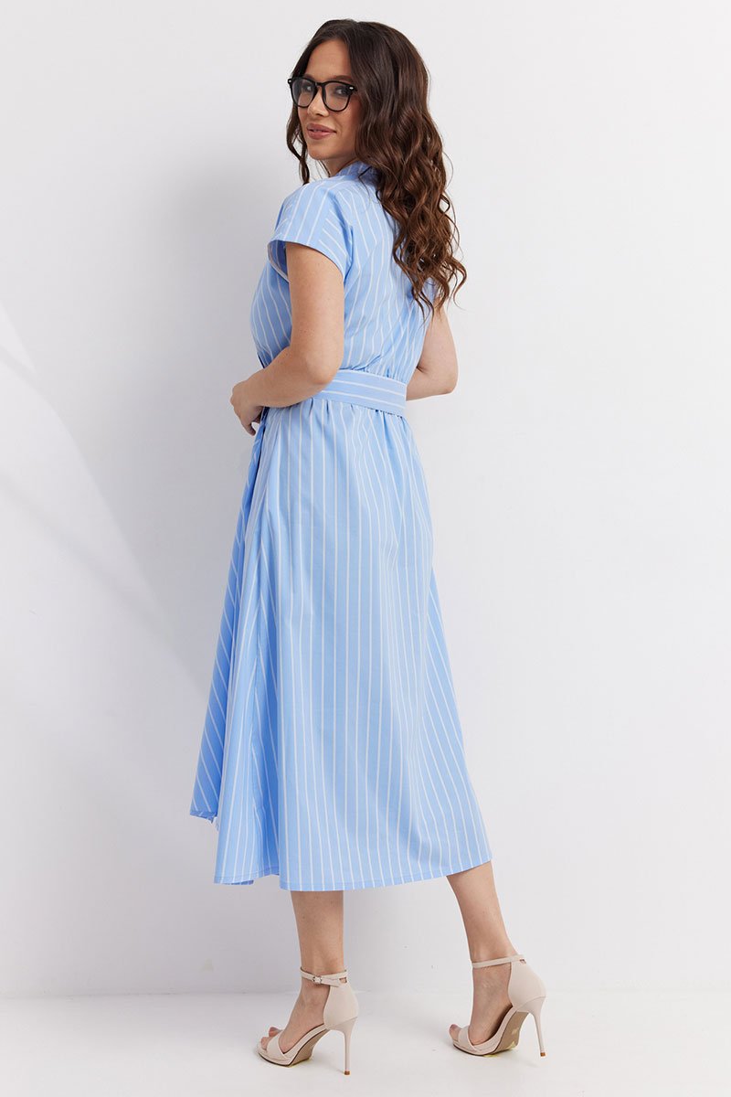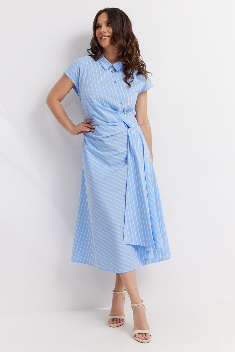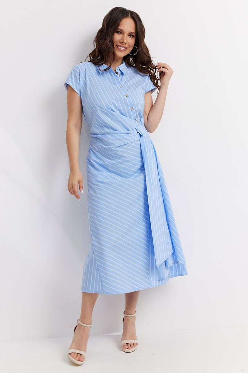 Стильное платье приталенного силуэта. Выполнено из хлопковой ткани. Рукав цельнокроеный, короткий. Горловина обработана отложным воротником. Центральная застежка выполнена с асимметрией, что придает платью уникальность. Низ платья расширен к низу. На талии оригинальная драпировка.