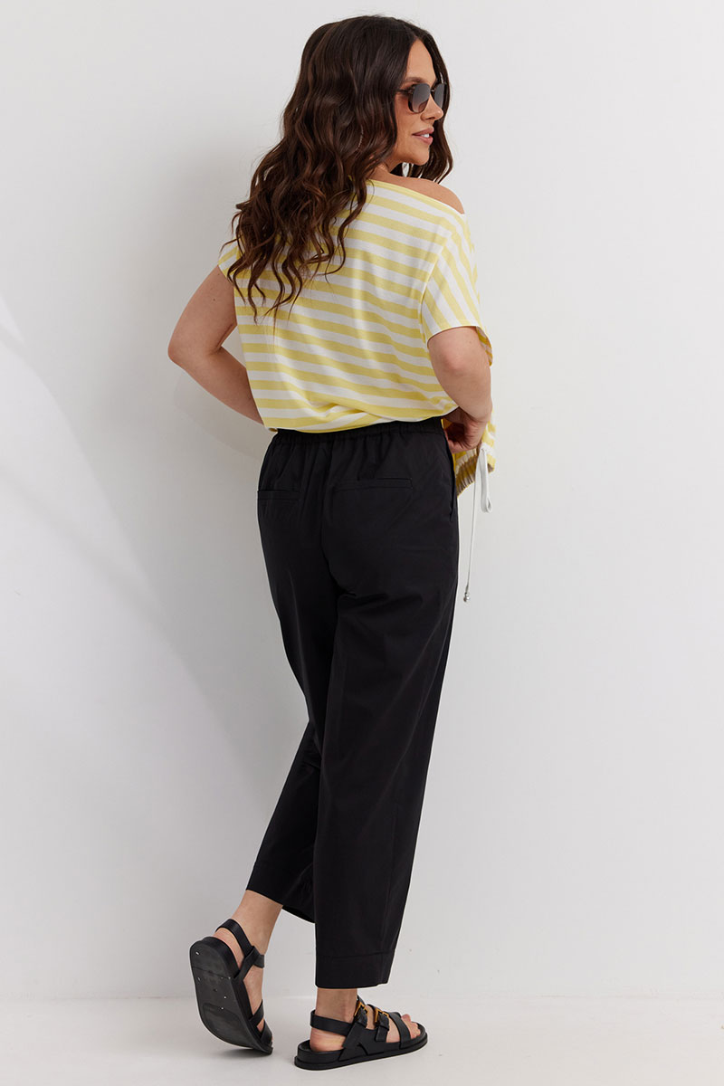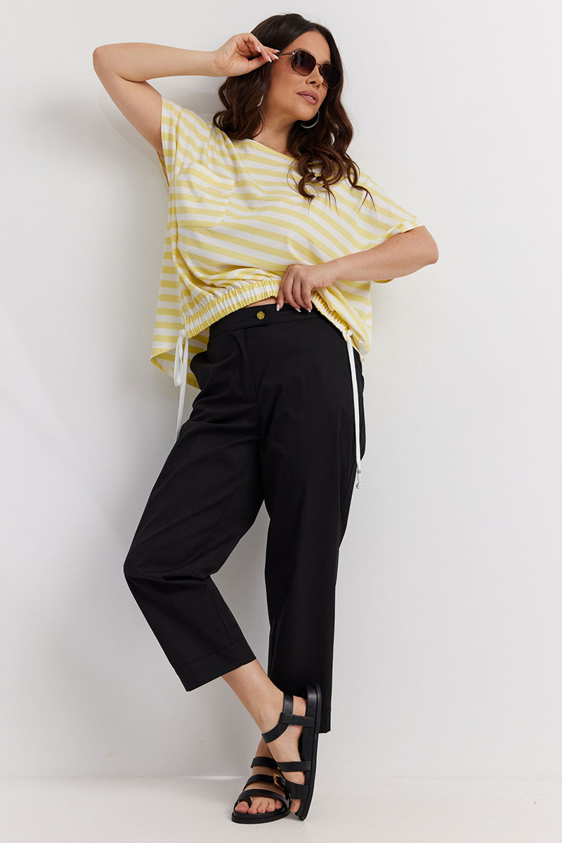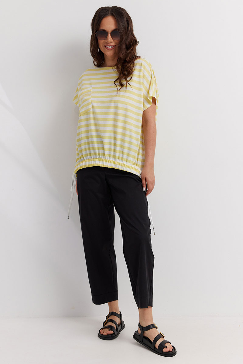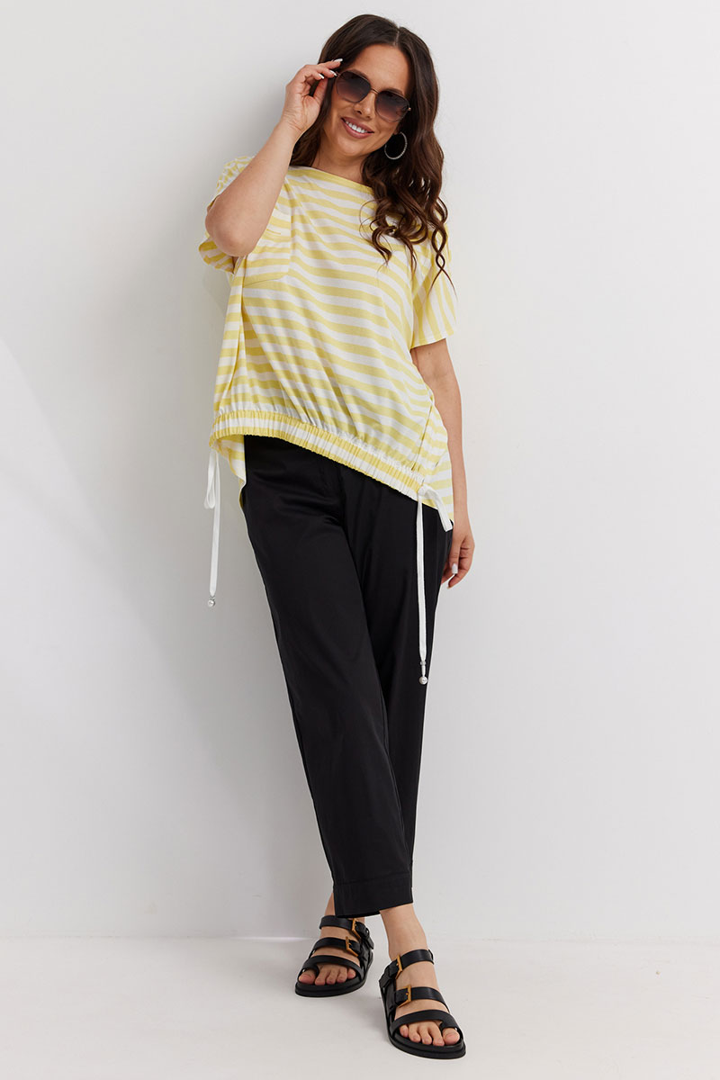 Футболка свободного кроя с коротким цельнокроеным рукавом. Выполнена из трикотажного полотна в стильную полоску. Для придания объема спереди по низу футболка дополнена скрытой кулиской на шнурке.