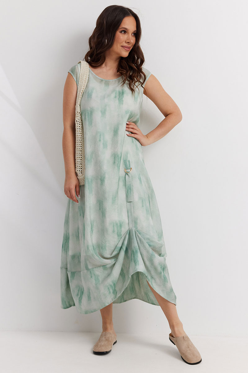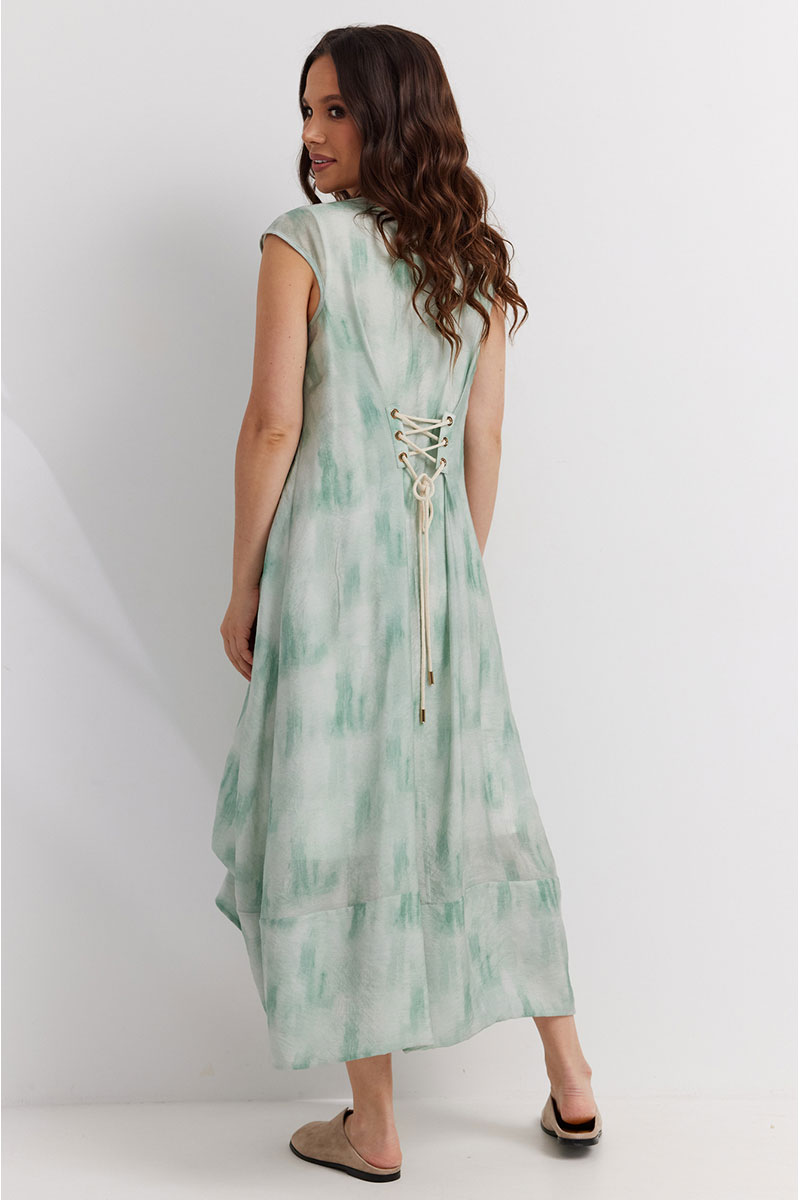 Двойное платье из натуральных тканей в потрясающей расцветке в технике TIE DYE. Верхнее платье из полупрозрачной воздушной ткани, нижнее платье из более плотной ткани в молочном оттенке. По низу для драпировки платье дополнено патой, что бы менять образ по вашему желанию. По спинке платье дополнено оригинальным элементом с регулировкой на декоративном шнурке по принципу корсета.