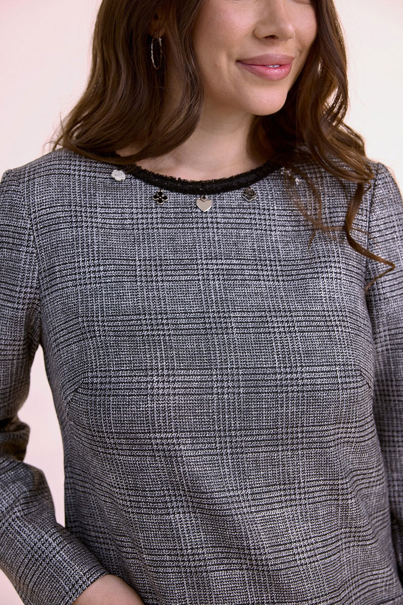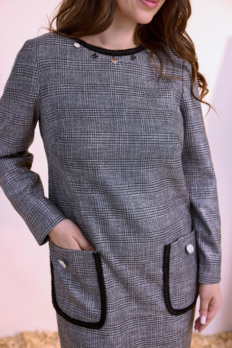 Элегантное платье полуприлегающего силуэта из комфортной костюмной ткани, без подкладки. Рукав длинный, втачной. По спинке застежка на молнию. Горловина с О-образным вырезом. Платье дополнено накладными карманами. Горловина и карманы дополнены красивой декоративной тесьмой. По спинке молния дополнена бархатным бантом.
