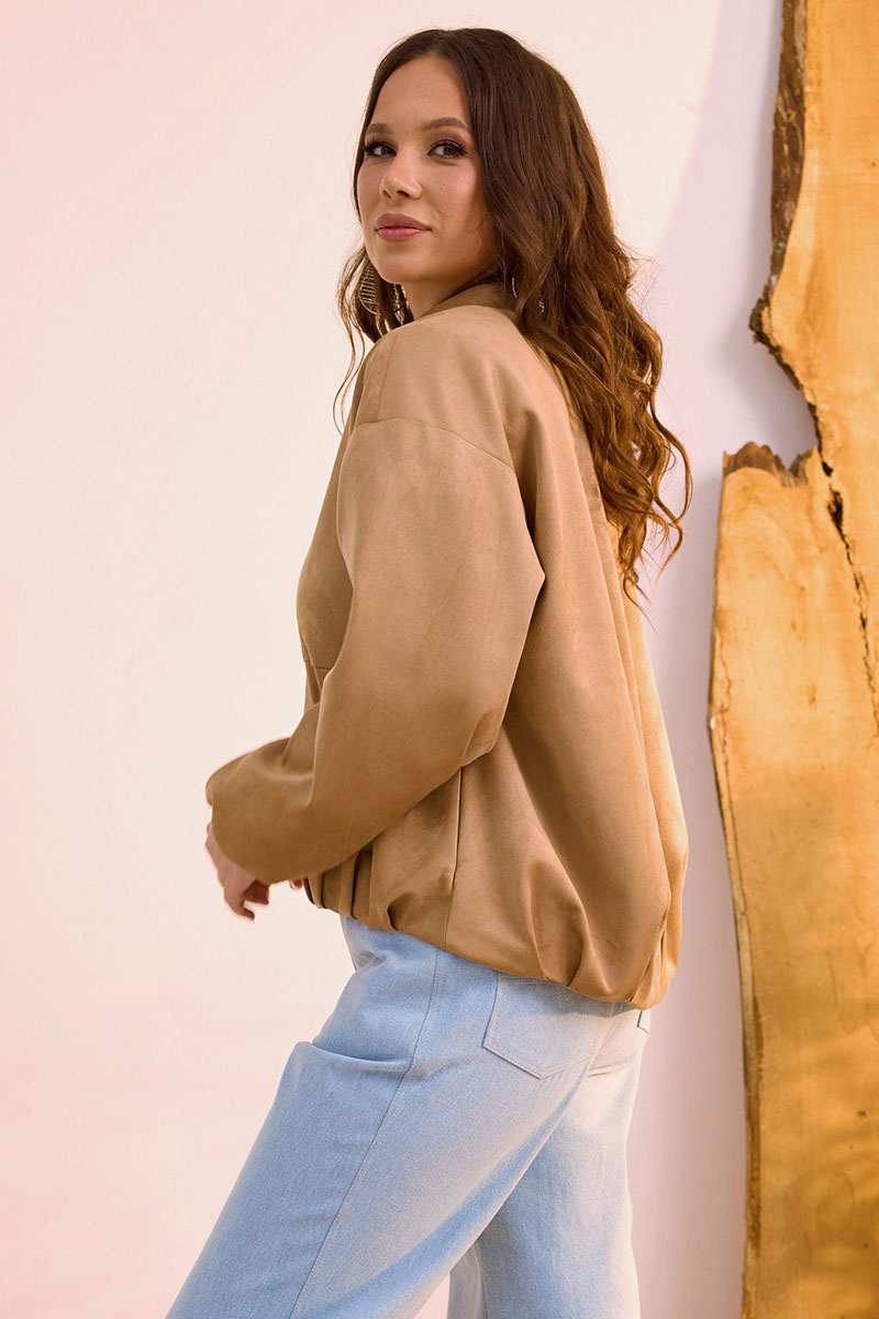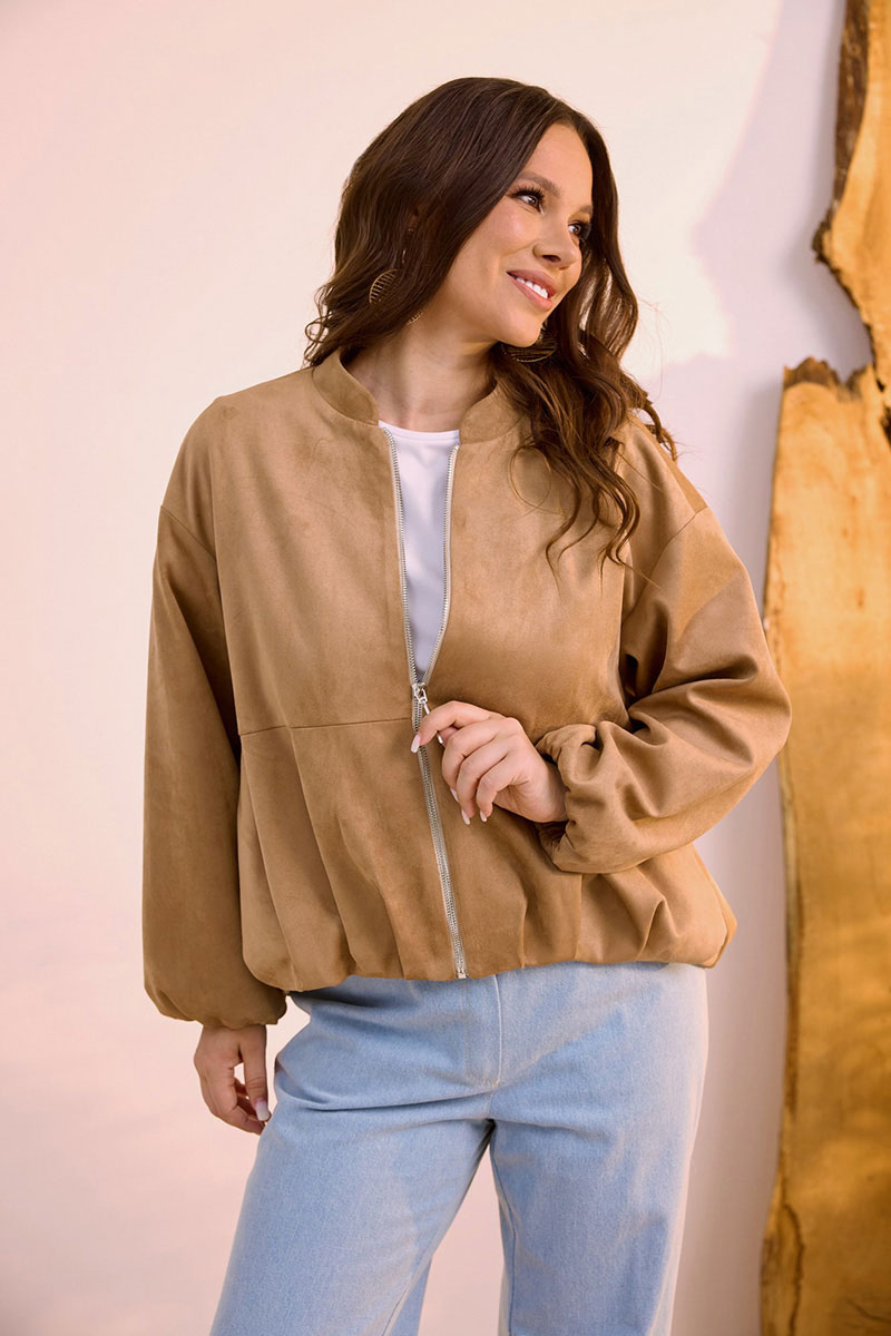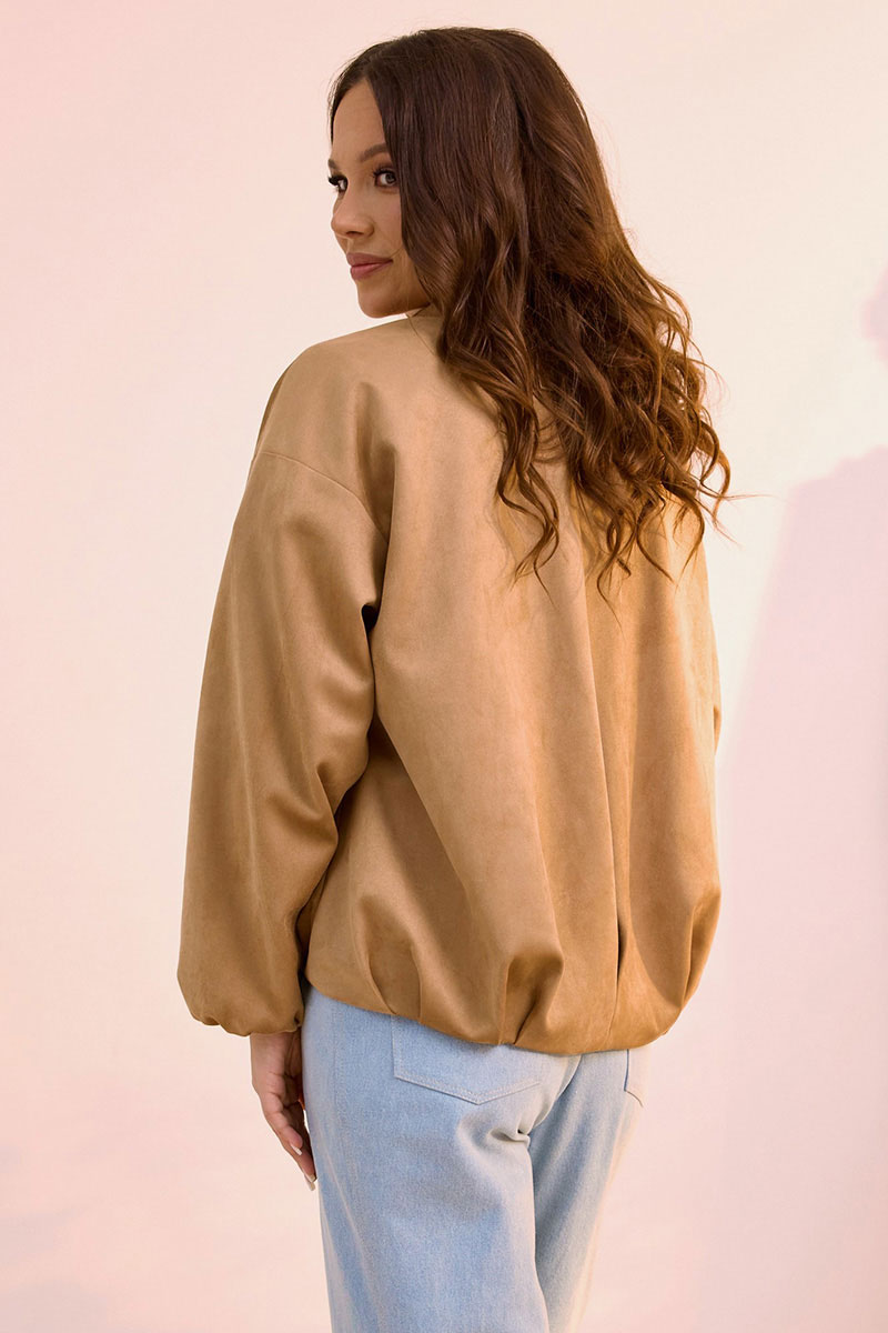 Стильная замшевая куртка в ТОПовом оттенке, которая так популярна в этом сезоне. Выполнена из текстильной замши премиум качества на подкладке без утеплителя. Можно использовать как бомбер и носить под верхнюю одежду. Куртка с центральной застежкой на металлическую молнию. Горловина обработана стойкой. Рукав втачной, слегка спущен. Перед куртки короче спинки. Куртка дополнена боковыми карманами.