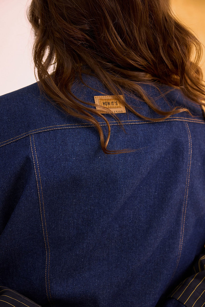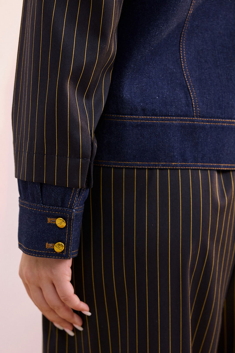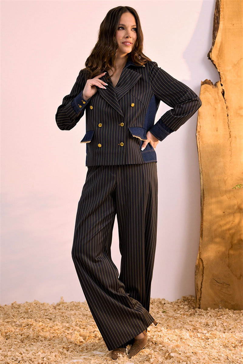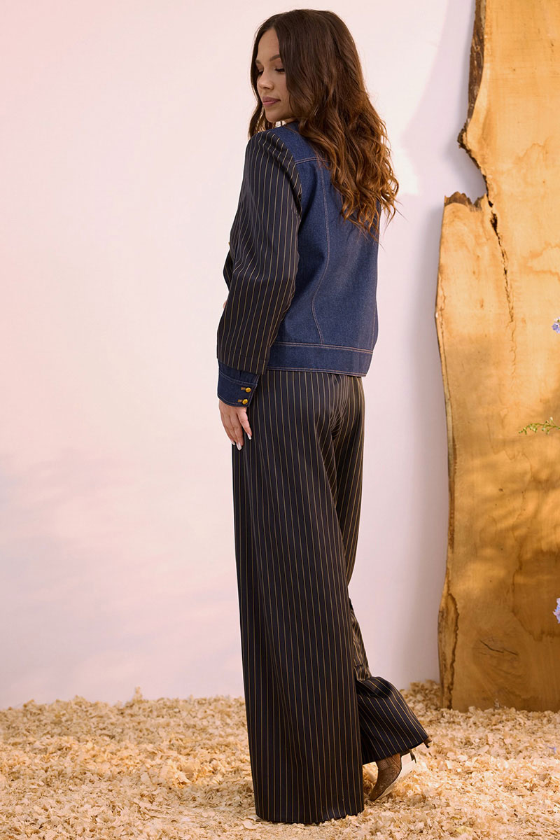 Двубортный жакет выполнен из костюмной ткани в комбинации с темно-синим джинсом. Жакет на подкладке с застежкой на пришивные пуговицы. Рукав втачной, дополнен манжетой из джинса. Воротник отложной.