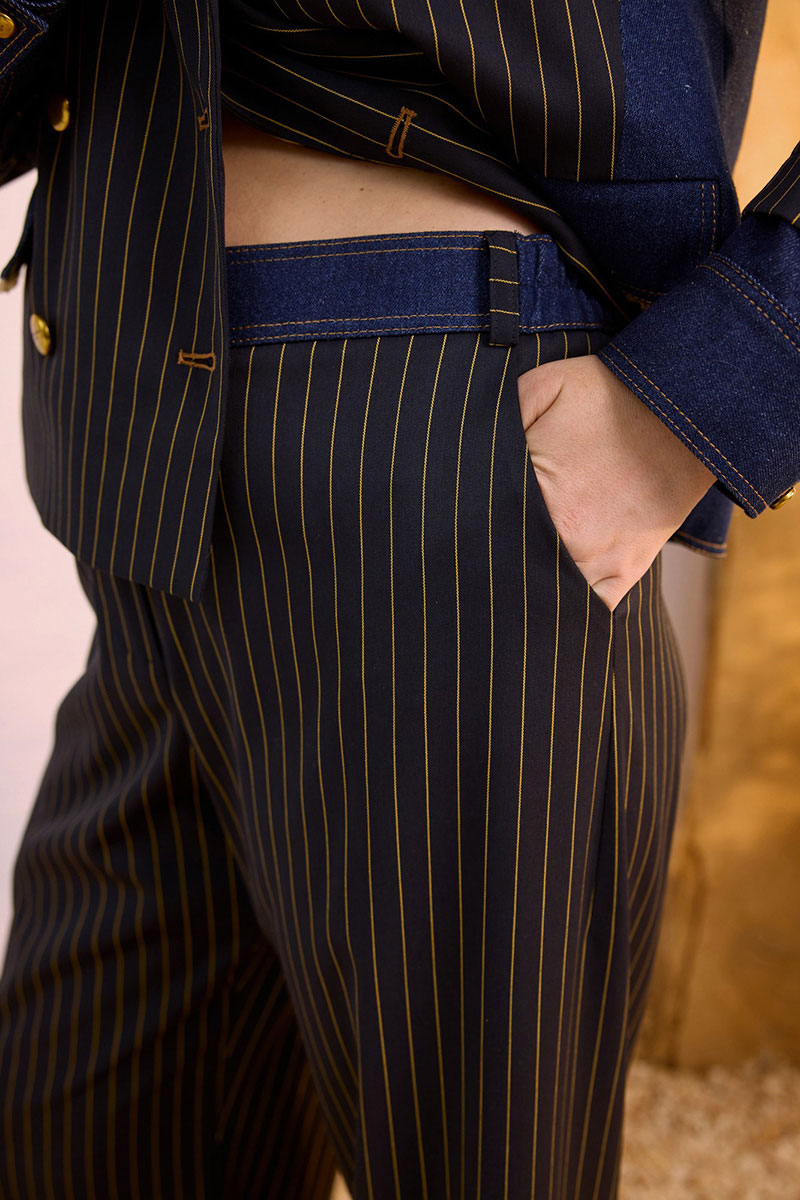 Брюки классического прямого кроя с притачным поясом, выполненным из джинса, дополненным эластичной тесьмой. Посадка средняя. Дополнены удобными боковыми карманами. Застежка гульфик на молнию и пришивную пуговицу. Брюки выполнены из комфортной костюмной ткани.