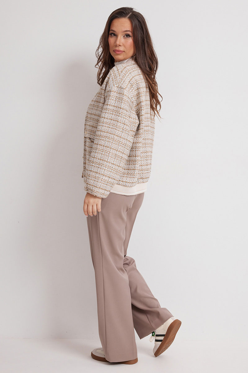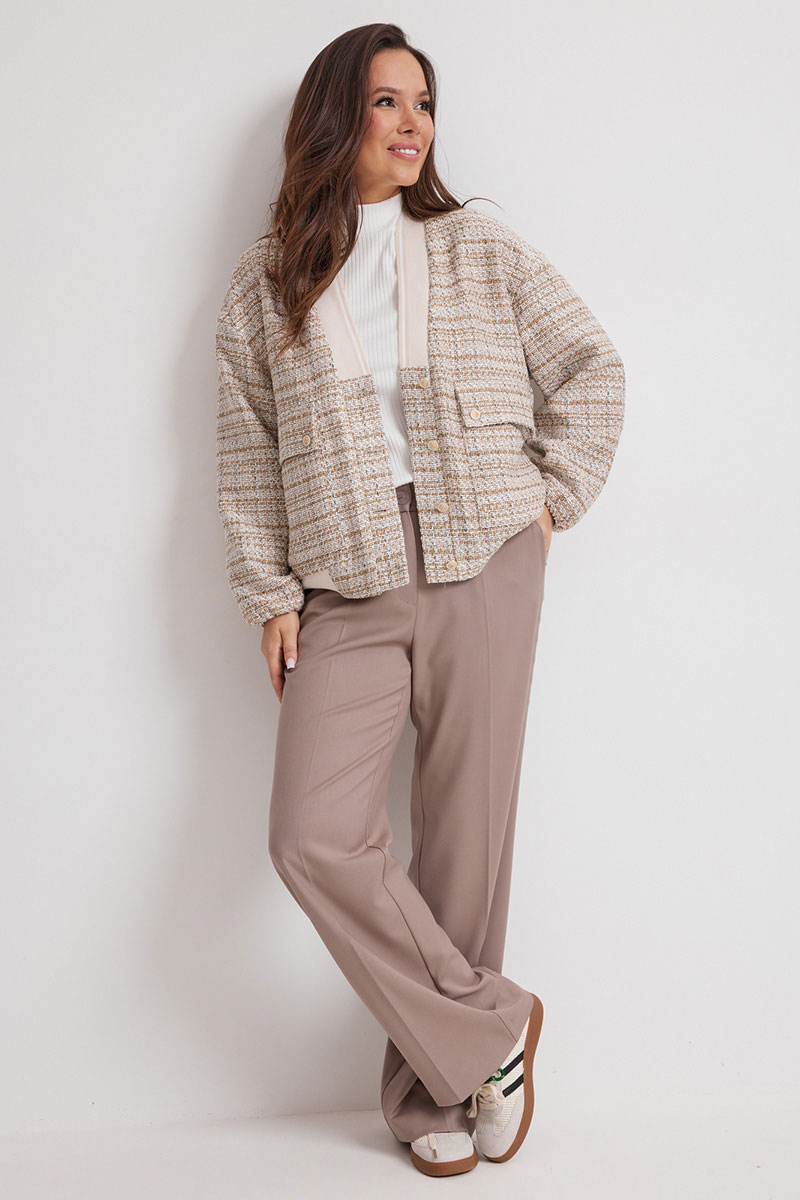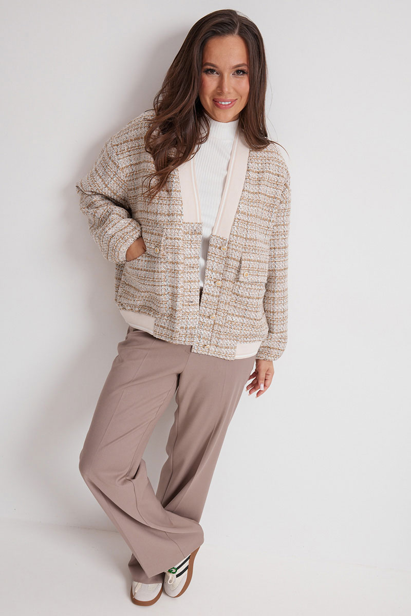 Бомбер свободного кроя, на подкладке, с центральной застежкой на красивые пуговицы. Выполнен из фактурной рогожки. Линия плеча слегка спущена. Горловина V-образная, обработана довязом. Бомбер дополнен функциональными боковыми карманами. Для придания легкого объема низ бомбера слегка присборен на эластичный довяз.