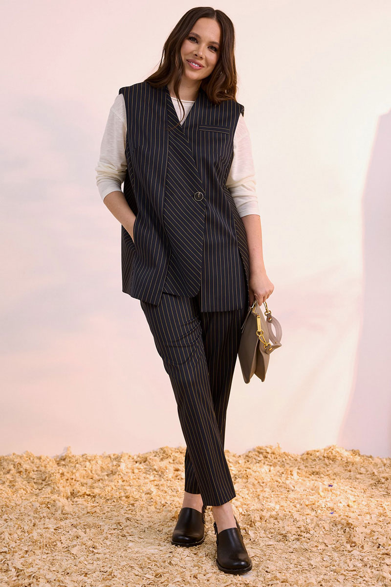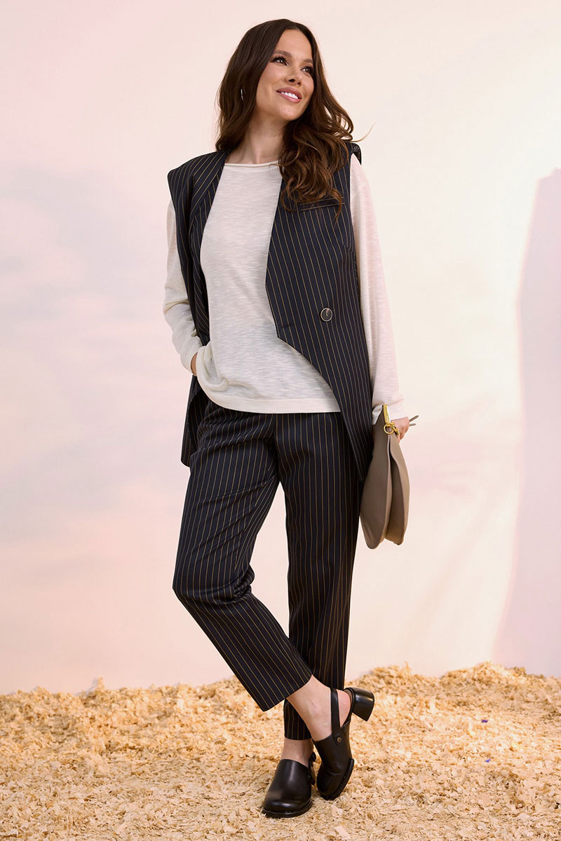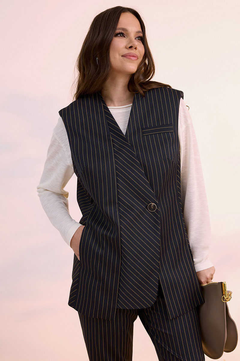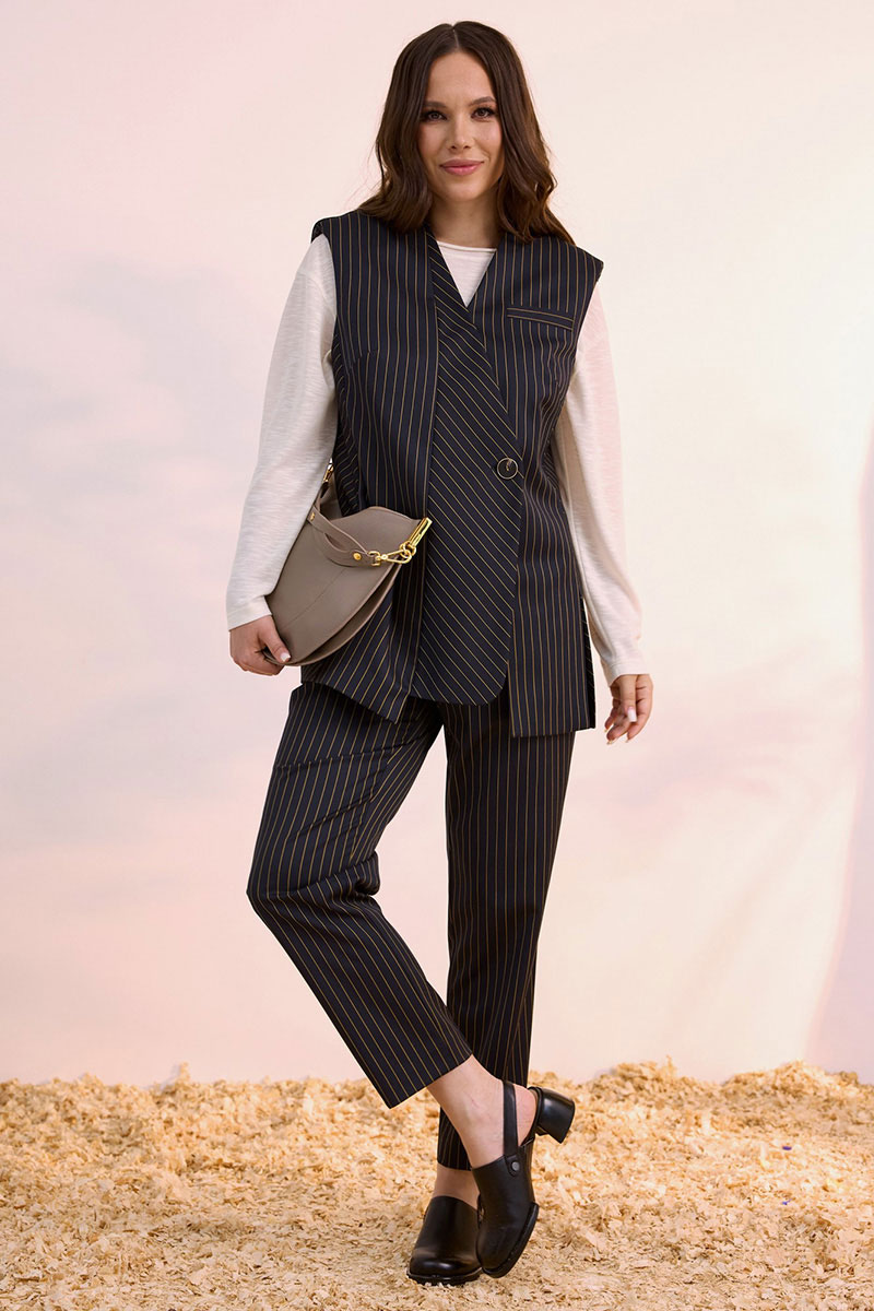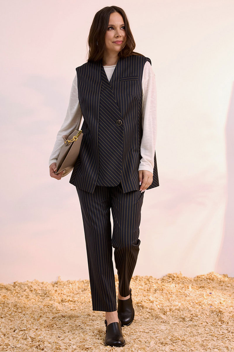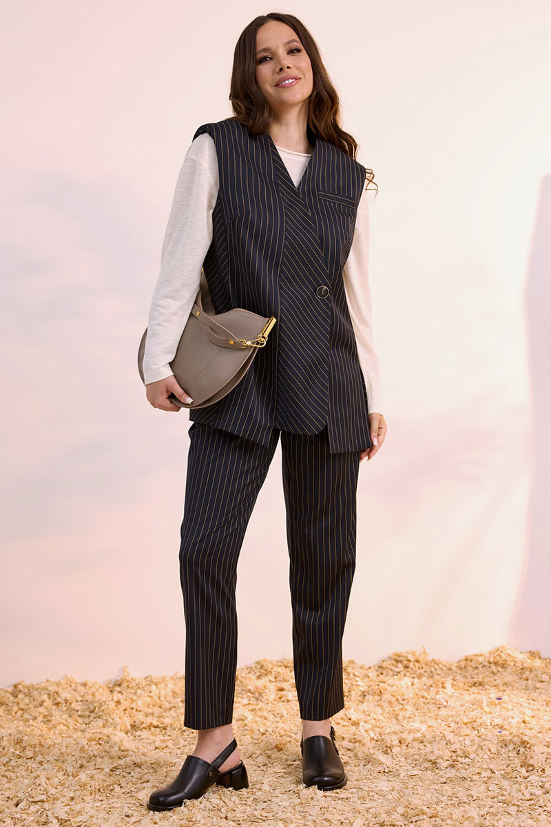 Стильный комплект из удлиненного жилета, лонгслива и брюк.