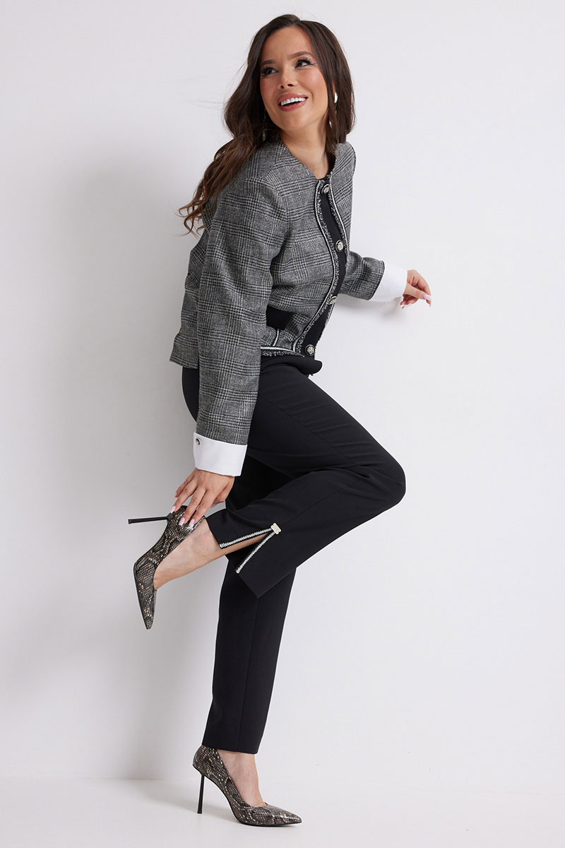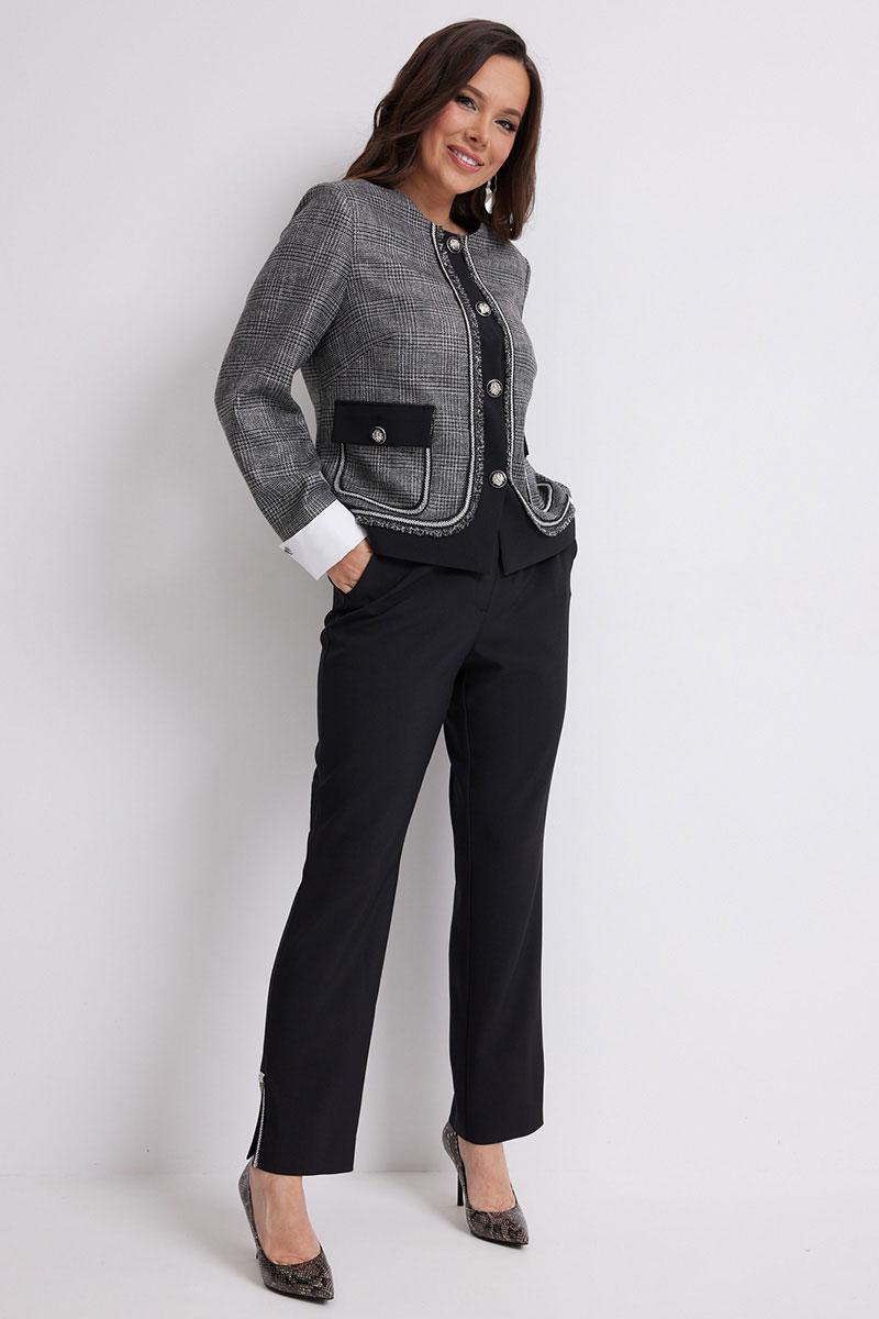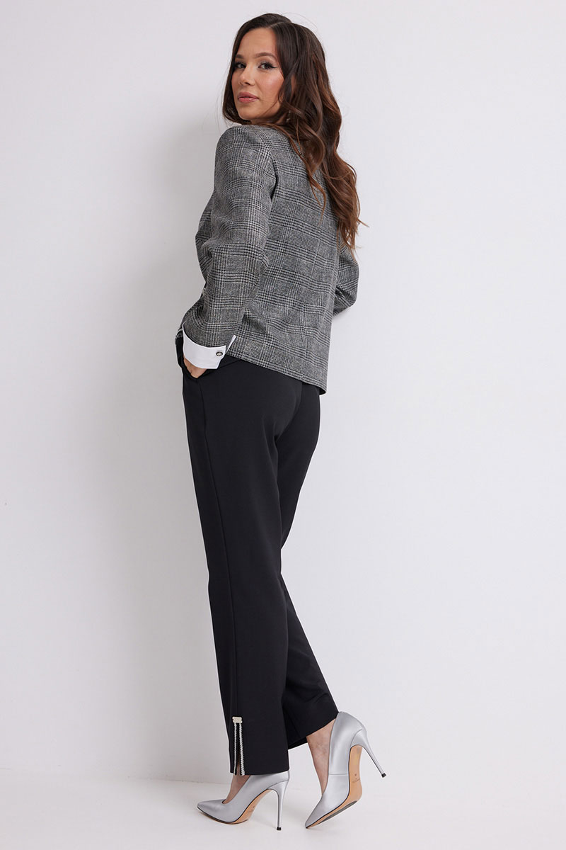 Жакет прямого кроя, на подкладке, с центральной застежкой на красивые пришивные пуговицы. Рукав втачной, дополнен съемными белыми манжетами. Выполнен жакет из красивой костюмной ткани. Брюки прямого кроя с притачным поясом, дополненным эластичной тесьмой. Посадка средняя. Застежка гульфик на молнию и пуговицу.
