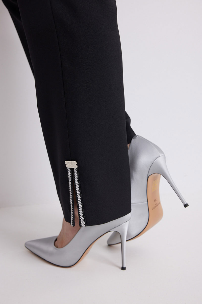 Брюки дополнены функциональными боковыми карманами, по низу брюк разрезы с отделкой декоративной тесьмой.