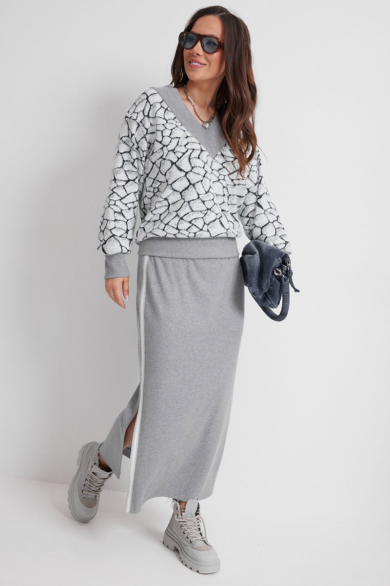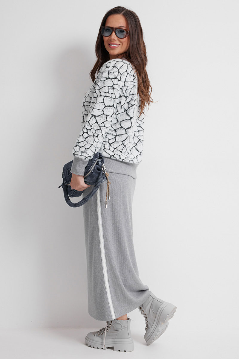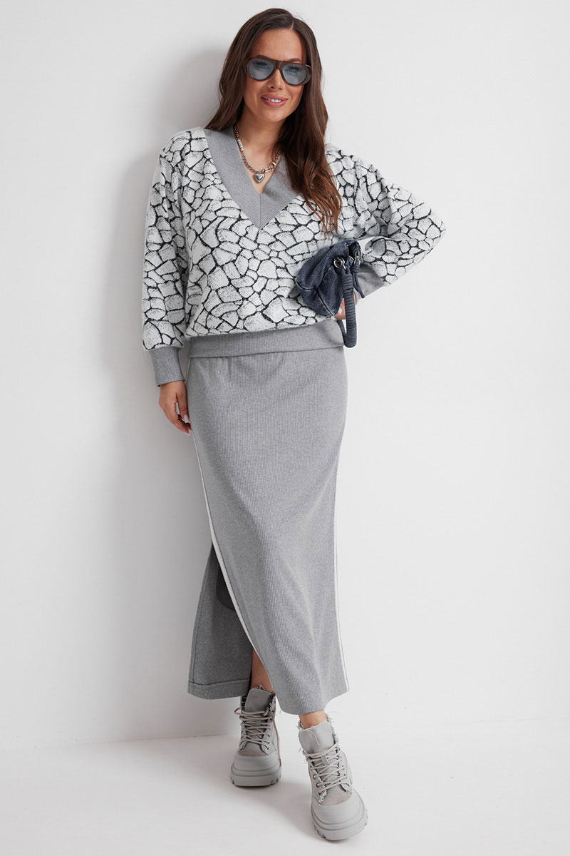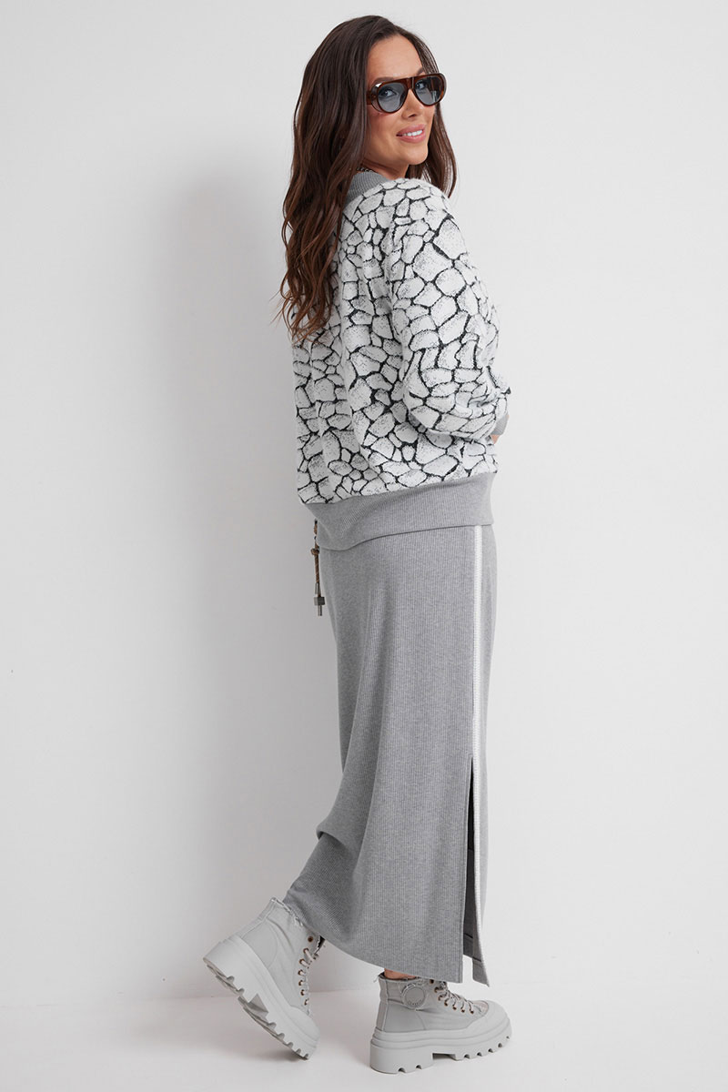 Юбка макси с одним боковым разрезом. Выполнена из приятного к телу трикотажа в рубчик. Дополнена отделкой из тесьмы по боковым швам. Юбка с притачным поясом, дополненным эластичной тесьмой.