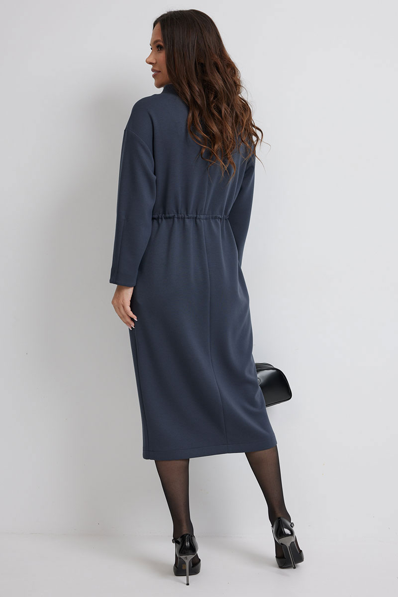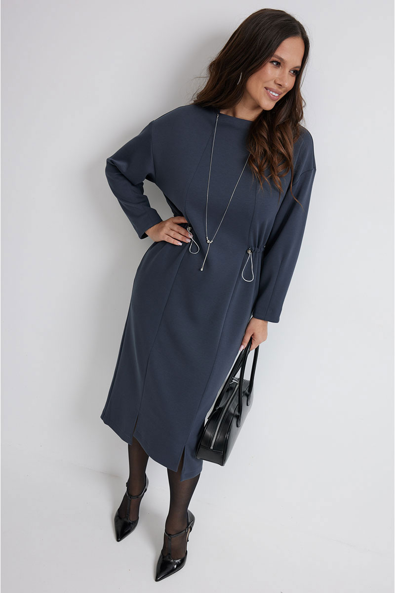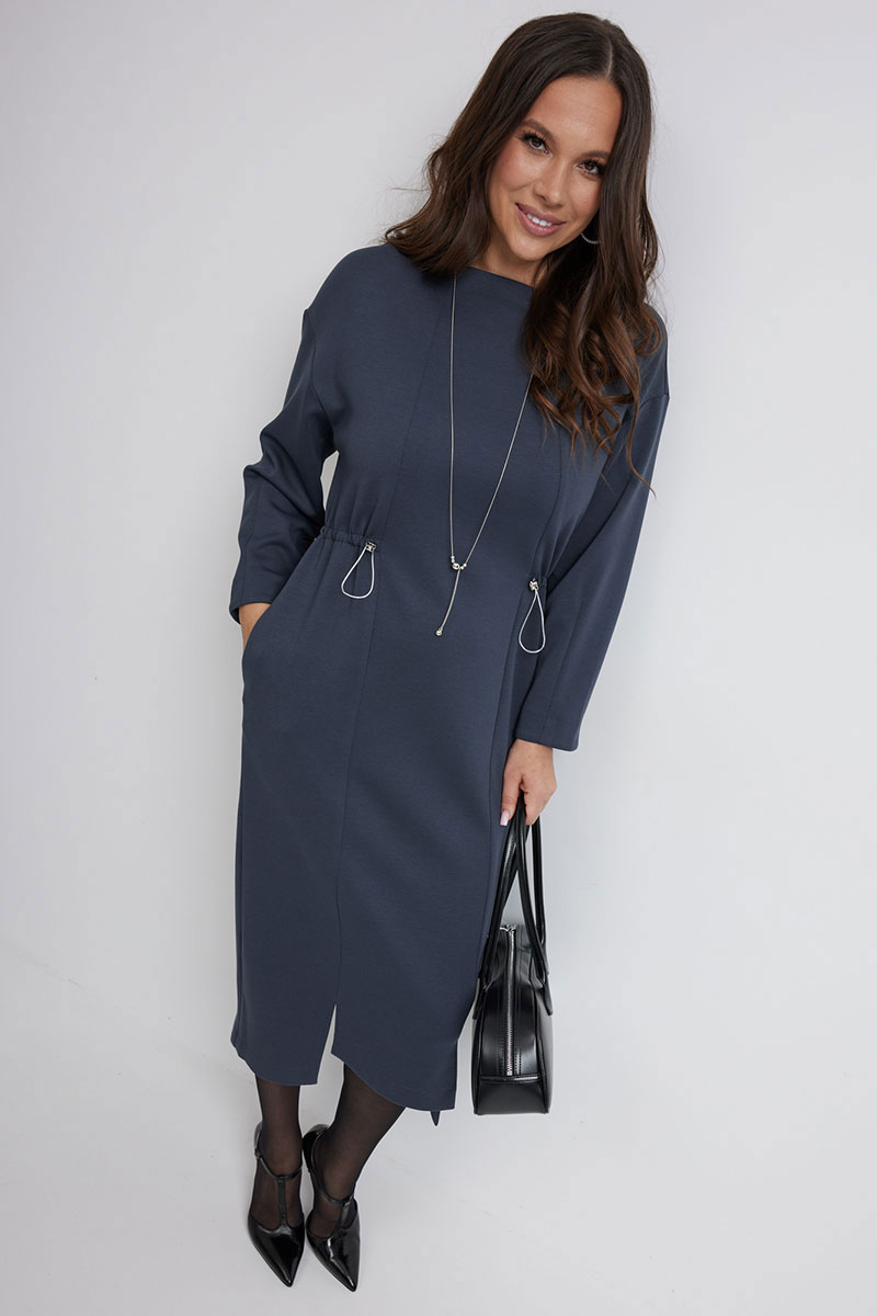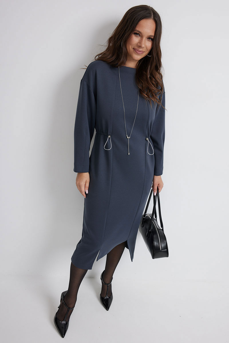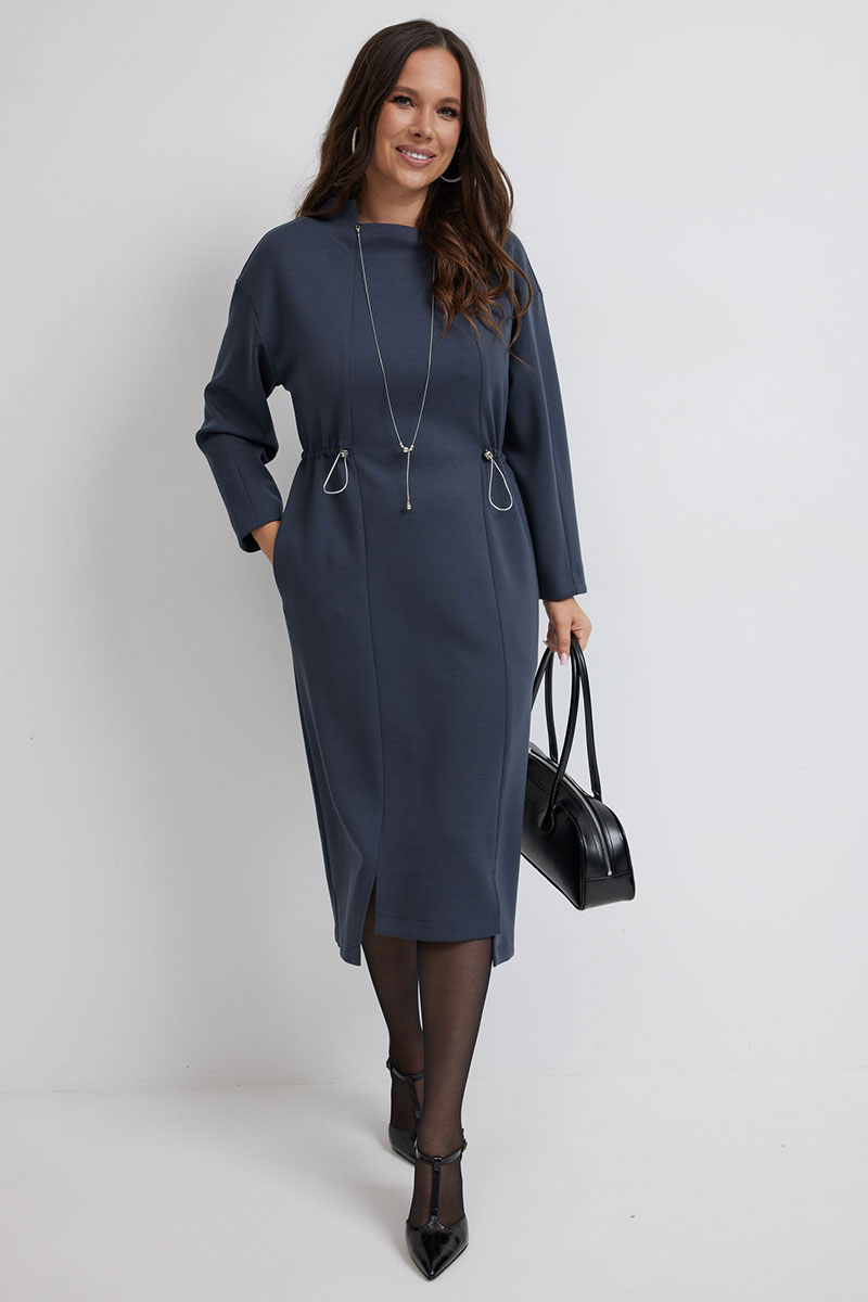 Стильное платье полуприлегающего силуэта. Выполнено из приятного к телу гладкого трикотажного полотна. Рукав длинный, слегка спущен. Цельнокроеная горловина полустойка образует красивый вырез. Платье приталено за счет скрытой кулиски с эластичной тесьмой с фиксаторами серебристого цвета. Так же платье дополнено съемным украшением из цепочек. В боковых швах расположены удобные карманы.