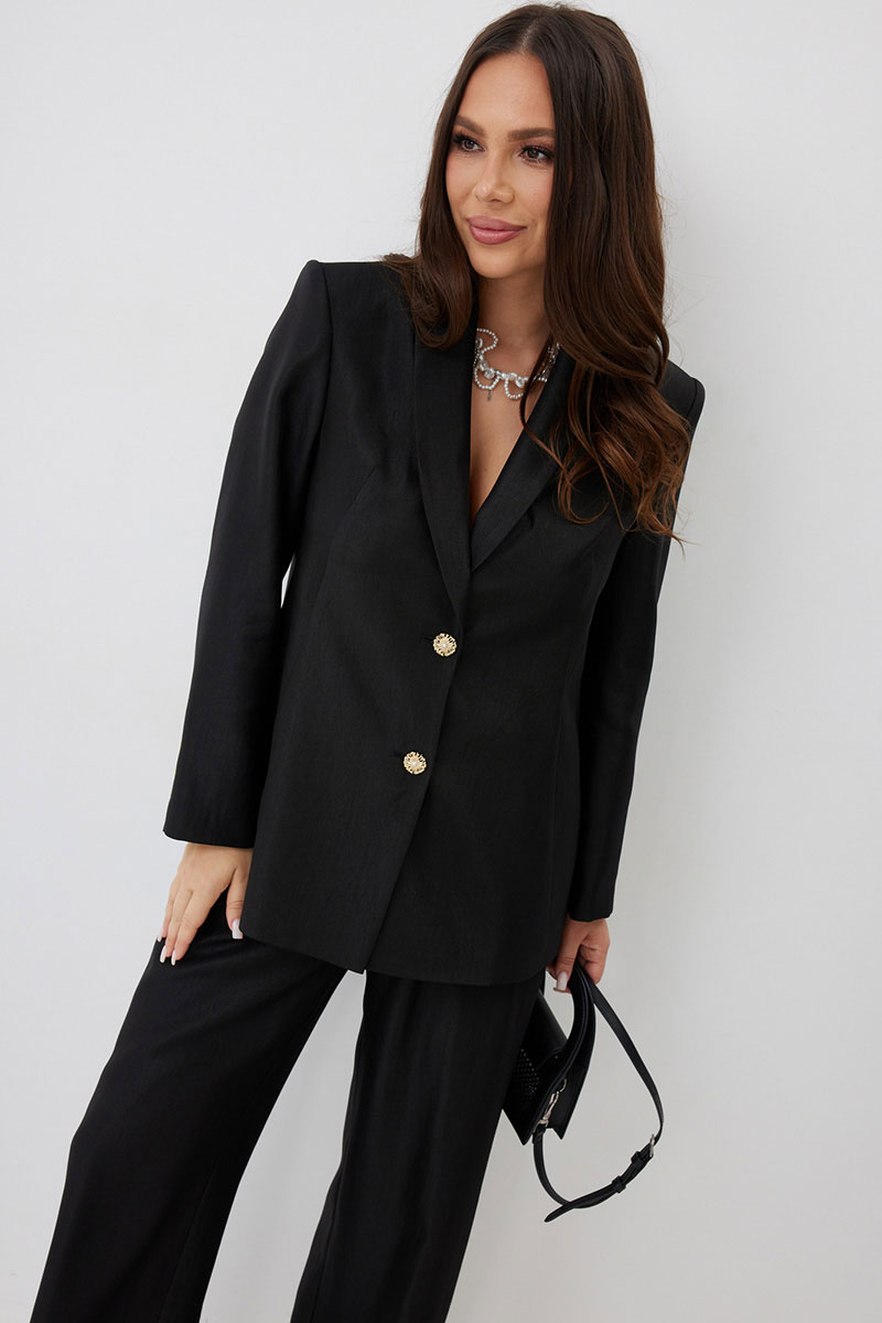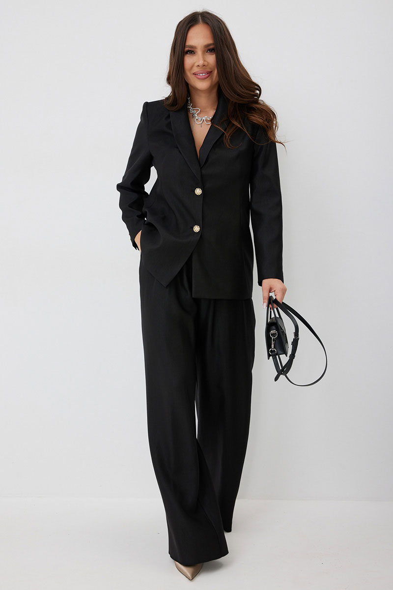 Элегантный и безумно красивый костюм из жакета и брюк. Выполнен из красивой гладкой костюмной ткани с легким жемчужным отблеском. Жакет прямого свободного кроя с красивыми рельефами, на подкладке, с центральной застежкой на пуговицы. Брюки классического прямого кроя с притачным поясом, дополненным эластичной тесьмой. Дополнены удобными боковыми и задними карманами. Застежка гульфик на молнию и пришивную пуговицу.