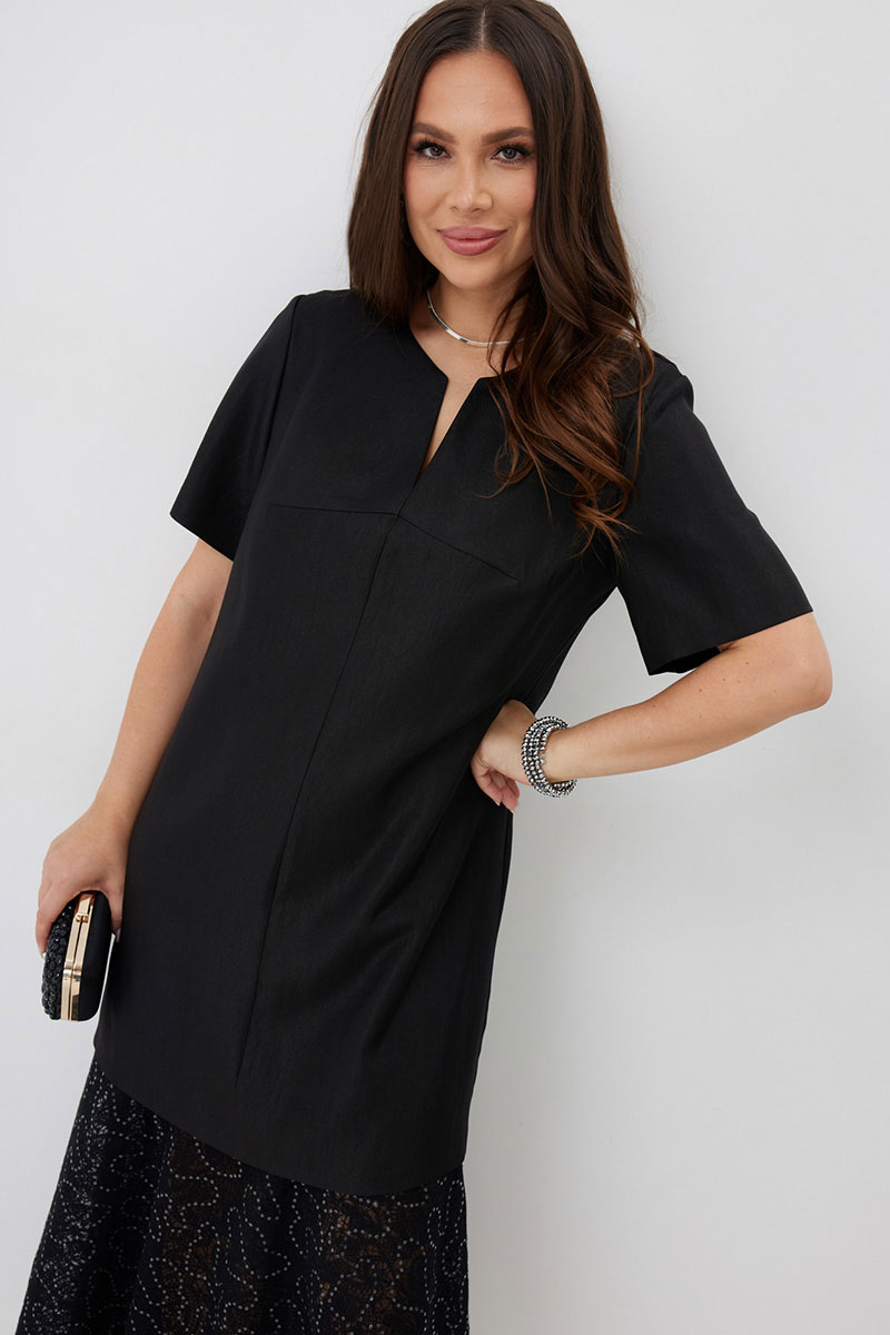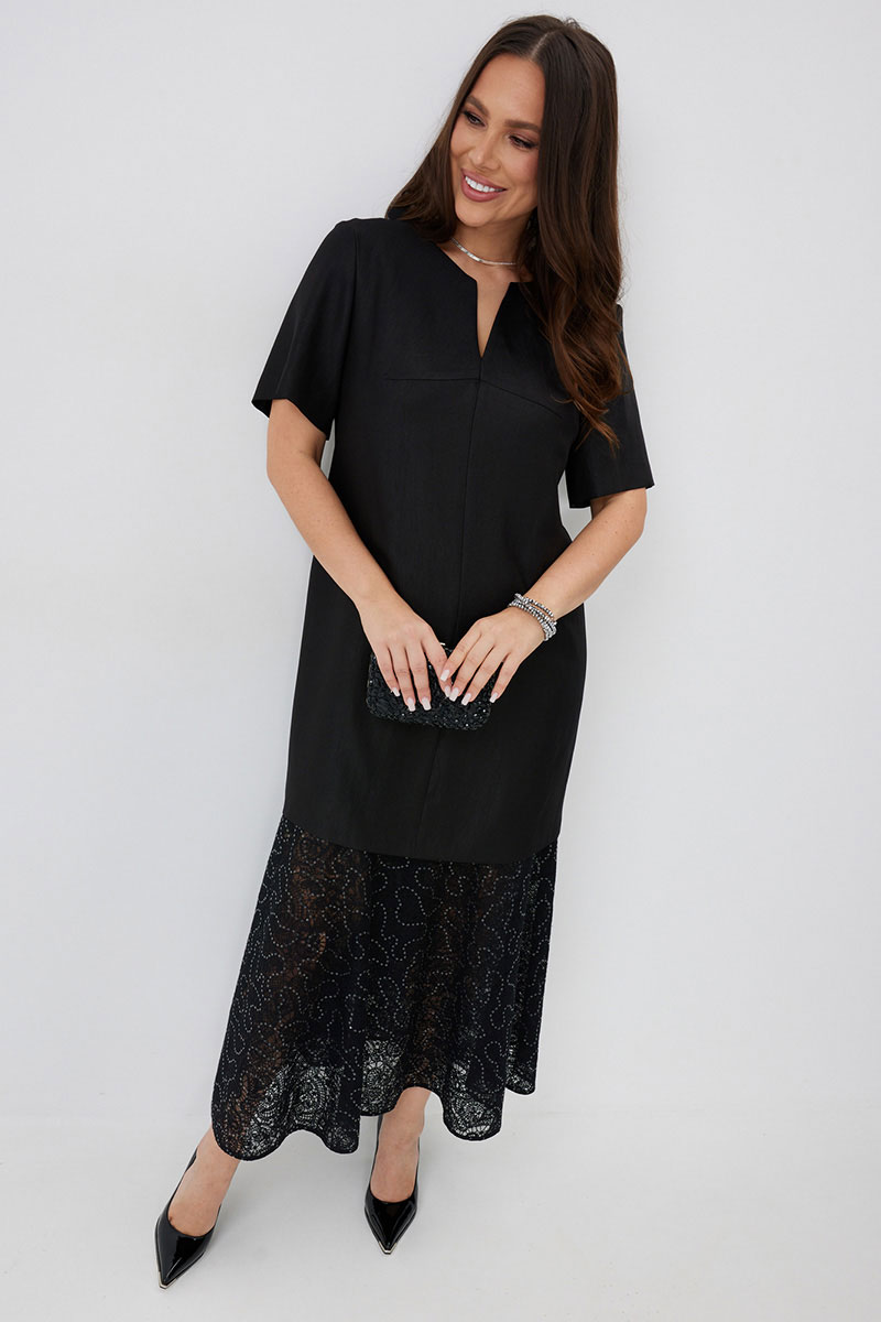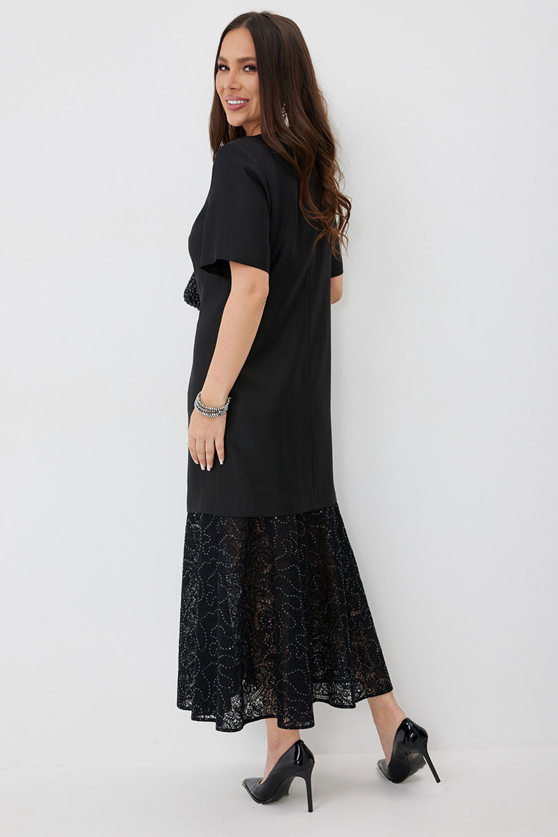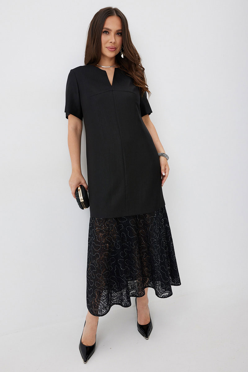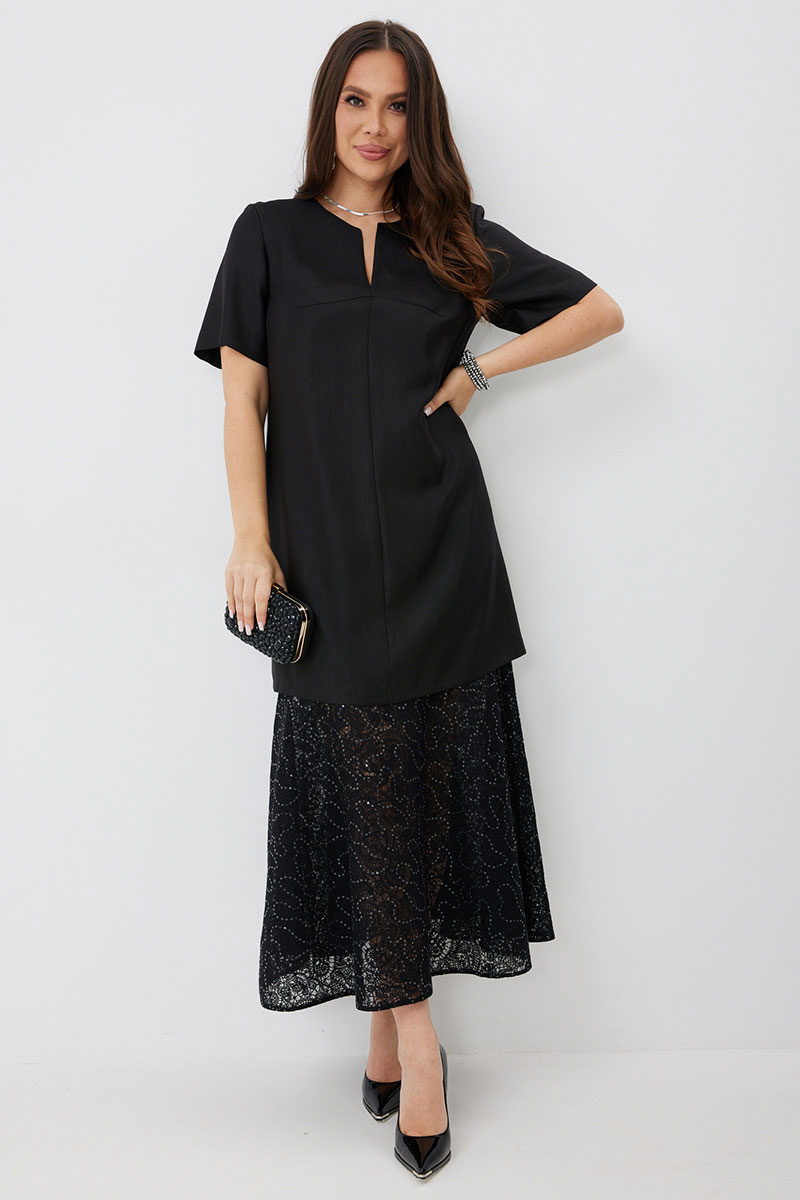 Элегантное платье свободного силуэта. Платье представлено, как нижнее платье из нежной подкладочной ткани, дополненной по низу притачным воланом из красивого кружева с пайетками, и верхнего короткого платья-туники из гладкой костюмной ткани. Застежка по спинке на потайную молнию.