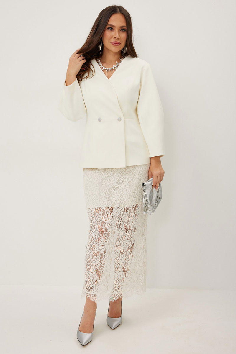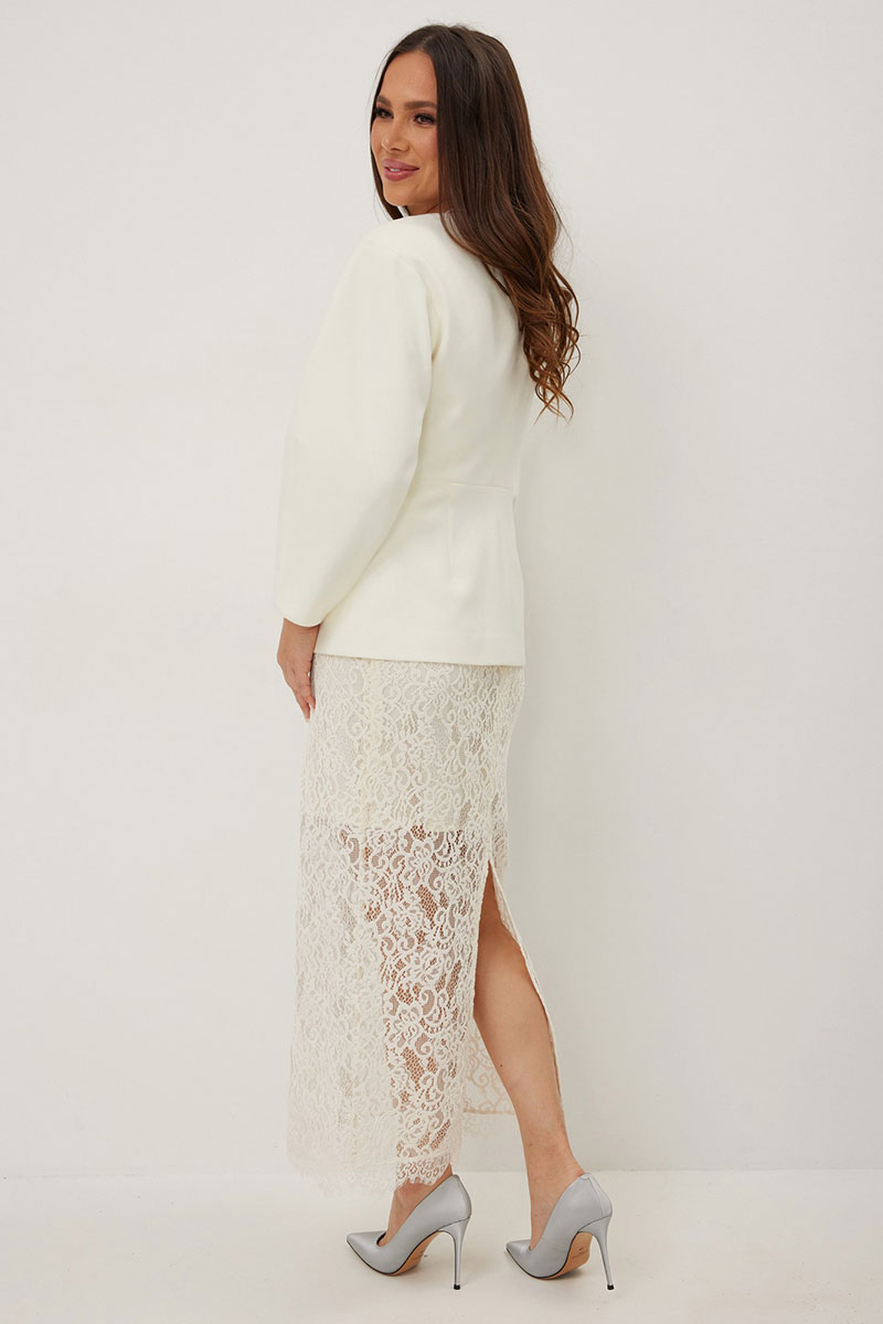Элегантный и безумно красивый комплект из жакета и кружевной юбки. Жакет двубортный приталенного силуэта с оригинальными объемными стильными рукавами. Жакет выполнен из красивой костюмной ткани на подкладке. Застежка на красивые пуговицы и потайную кнопку. Юбка миди прямого классического кроя с притачным поясом, дополненным эластичной тесьмой. Выполнена из красивого бархатного кружева на подкладке.