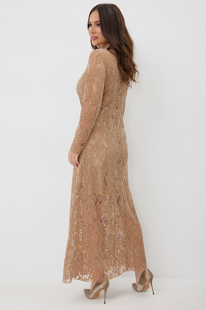 Элегантное и стильное платье макси из нежного бархатного кружева. Платье прилегающего силуэта с легким клешением книзу. Платье дополнено нижней комбинацией на тонких бретелях, выполненной из приятной к телу ткани в цвет кружева. Рукав втачной, дополнен притачным, слегка расклешенной кружевной манжетой с открытым срезом. Спереди плате с фигурным подрезом. Горловина обработана стойкой. Низ платья с открытым срезом.