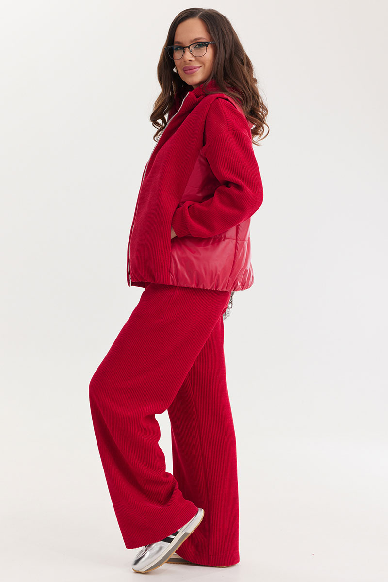 Стильный и уютный комплект из утепленного жилета, худи и брюк, выполненных из фактурного трикотажного полотна (штрукс). Жилет свободного прямого кроя с центральной застежкой на металлическую молнию. Горловина обработана стойкой. Перед жилета выполнен из трикотажного полотна, спинка выполнена из плащевой ткани. Жилет дополнен удобными боковыми карманами. Худи свободного прямого кроя со слегка спущенным рукавом. Дополнено уютным капюшоном и застежкой на металлическую молнию. Для придания формы по низу расположена кулиска на резинке с фиксаторами. Так же худи дополнено удобными карманами. Брюки прямого свободного кроя, с притачным поясом, дополненным эластичной тесьмой. Посадка средняя. По бокам брюки дополнены удобными карманами.