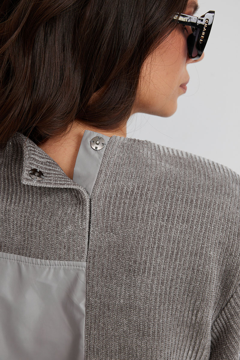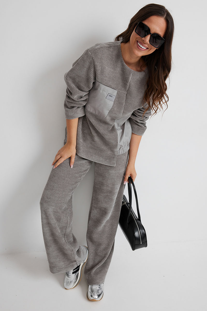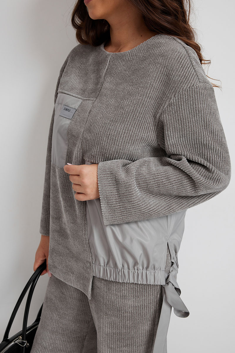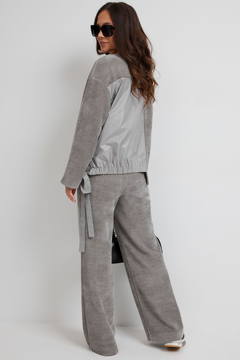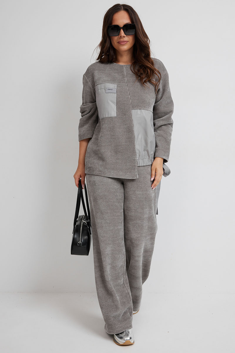 Стильный костюм из джемпера и брюк. Выполнен из фактурного трикотажного полотна (штрукс) в комбинации с красивой мягкой плащевой тканью. Джемпер свободного кроя с застежкой по спинке на кнопки. Рукав слегка спущен. По низу джемпер дополнен красивой сборкой на эластичную тесьму и завязывается в красивый бант. Брюки прямого свободного кроя, с притачным поясом, дополненным эластичной тесьмой. Посадка средняя. По бокам брюки дополнены удобными карманами.